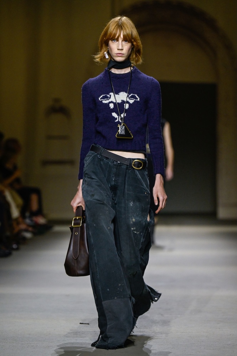 トップスの裾に大胆なシャギー調のフリンジを配したのは、「マックイーン(McQUEEN)」のデニムルック。バスト下をほつれさせたかのような、手の込んだフリンジが印象的です。お腹を透かして見せて、ほのかにセンシュアルなムードを演出。リズミカルに跳ねるフリンジが、ドラマチックな表情を添えています。パンツはウエストを折り返したトリッキーなデザインで立体感を強調。腰回りを華奢に見せる効果も生み出しています。