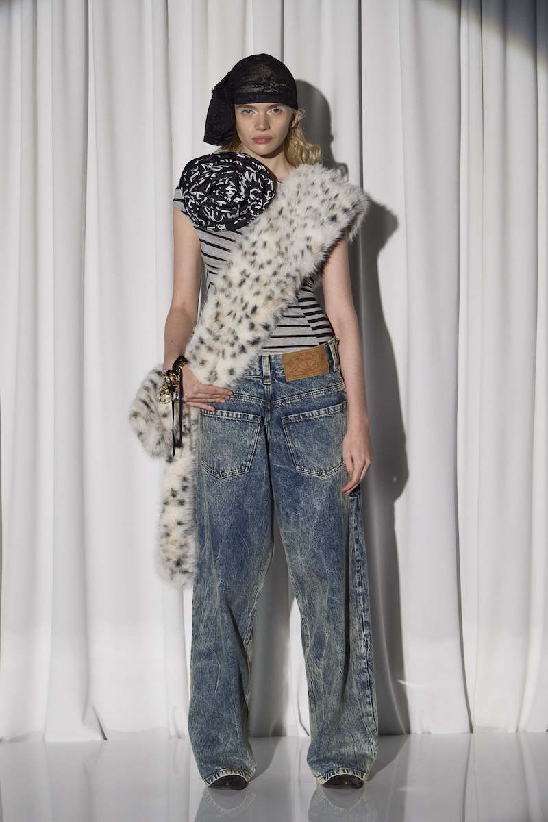 「ヴァケラ(VAQUERA)」のデニムパンツは、一瞬、目を疑うような“前後逆転”の仕立て。ベルト通しやヒップポケットまで正面に配置した、インパクト大のデザインです。ボーダーのトップスはウエストイン。ファーを斜め掛けし、右胸には特大のコサージュを添えて、デニムルックに華やぎを加えました。