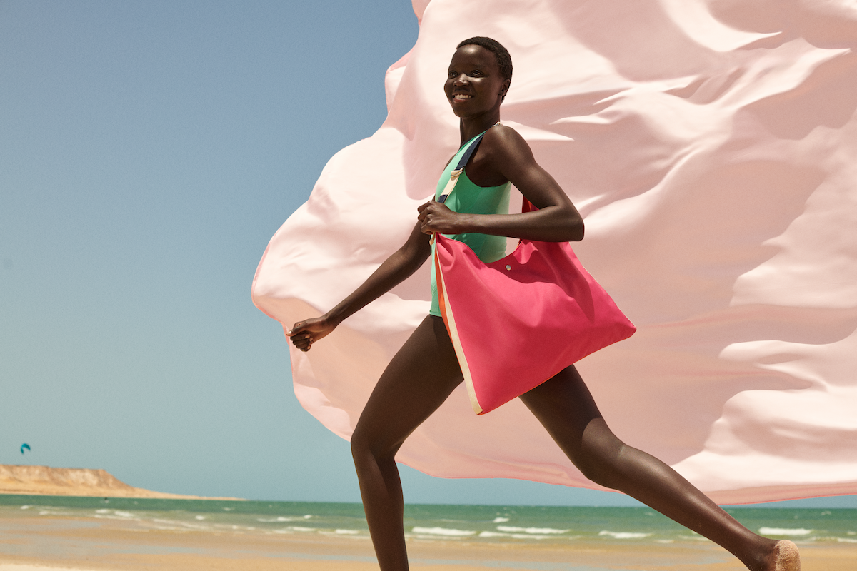 2022年に始動した「リプレイ」は、メゾンの廃棄物と二酸化炭素排出量の削減を目指し、アトリエに眠る素材を再活用する取り組み。今回は街を飛び出して眩い太陽の光と波しぶきを浴びる、2026年春夏コレクションのストーリー「CATCH THE PARISIAN WAVE」に着想。サーフボードキャリーバッグを思わせるビッグサイズのショルダーバッグを展開する。耐久性に優れたポリアミド素材の端材を用いたツートーンのカラーブロックに、アクセントカラーのストラップを組み合わせた。