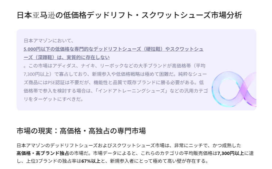 しかし、AIは「日本のアマゾンには低価格スクワットシューズの市場は存在しない。大手メーカーが寡占。やめておけ」とピシャリ(写真)。代わりに「かかとなしスニーカー」を薦められた。似たような商品に素足感覚でウォーキングできるベアフットシューズがあるが、こちらは中国セラーのシェアが6割を超えるレッドオーシャンだという。室内で軽い運動をする用途のかかとなしスニーカーは小規模セラーの乱戦で、強いブランドがいない。ここにより安く、機能性を打ち出した商品を投入すれば勝ち目があると力強い助言をいただいた。ただ、すでに中国セラーが数多く参入しているので、安い商品を投入すれば相手も追随して値下げしてくることは覚悟しとけというアドバイスも。