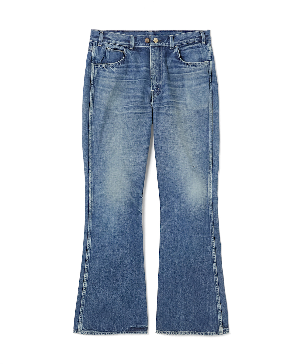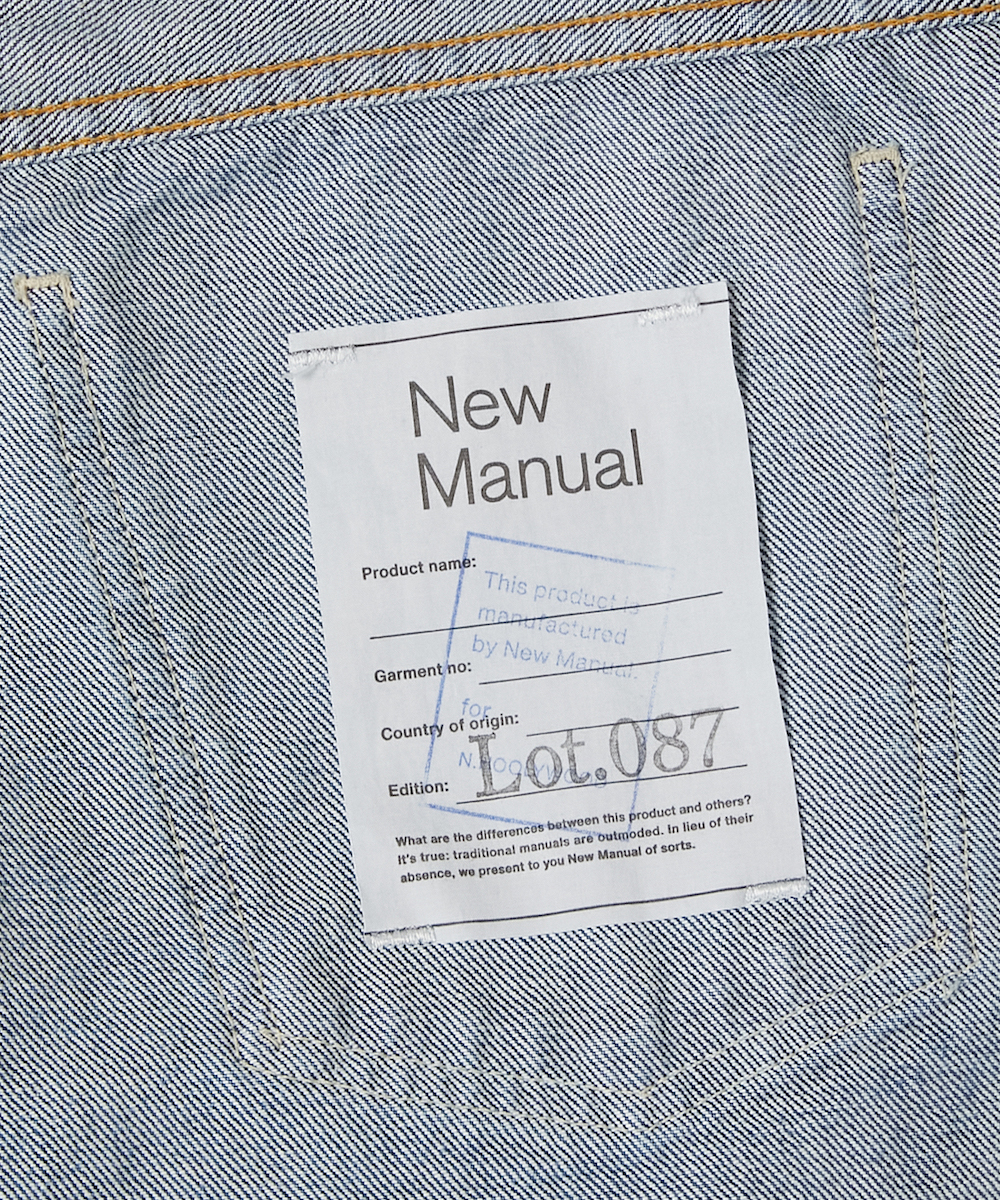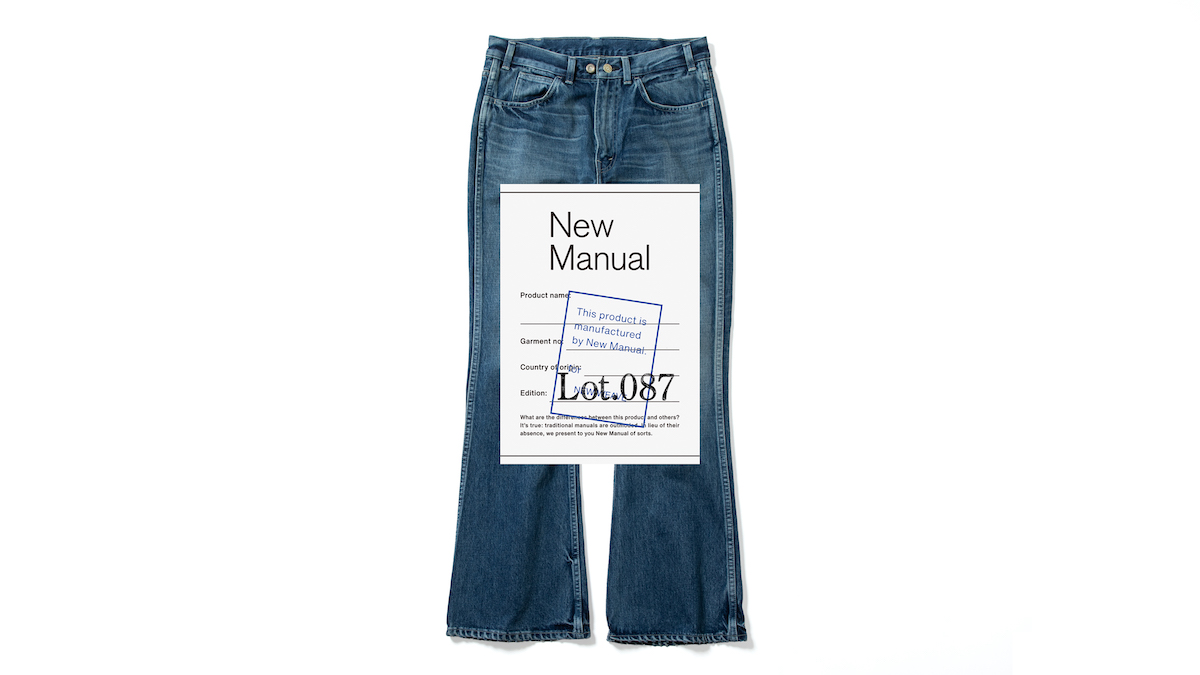 「N.ハリウッド」と「ニューマニュアル」は、2023年の初コラボ以来これまで何度も協業を重ねてきた。今回は、尾花大輔「N.ハリウッド」デザイナーが岡山のデニム加工会社「ゆとり18(癒toRi18)」を訪れた際に発見し、近年愛用しているフレアシルエットの名品をベースに、1960年代の約1年間のみ生産された希少なデニムを再構築。「ニューマニュアル」の加工技術でサイズ感やダメージなど当時の空気感を踏襲しながら、ウエストに両者のオリジナルボタンを2つ配置したほか、ヒップポケットに「N.ハリウッド」のタグをあしらい、ヒップポケット裏にはコラボ専用のネームを施した。なお、コラボネームに尾花デザイナーの私的プロジェクトを示す“Lot.087”をプリントしている。