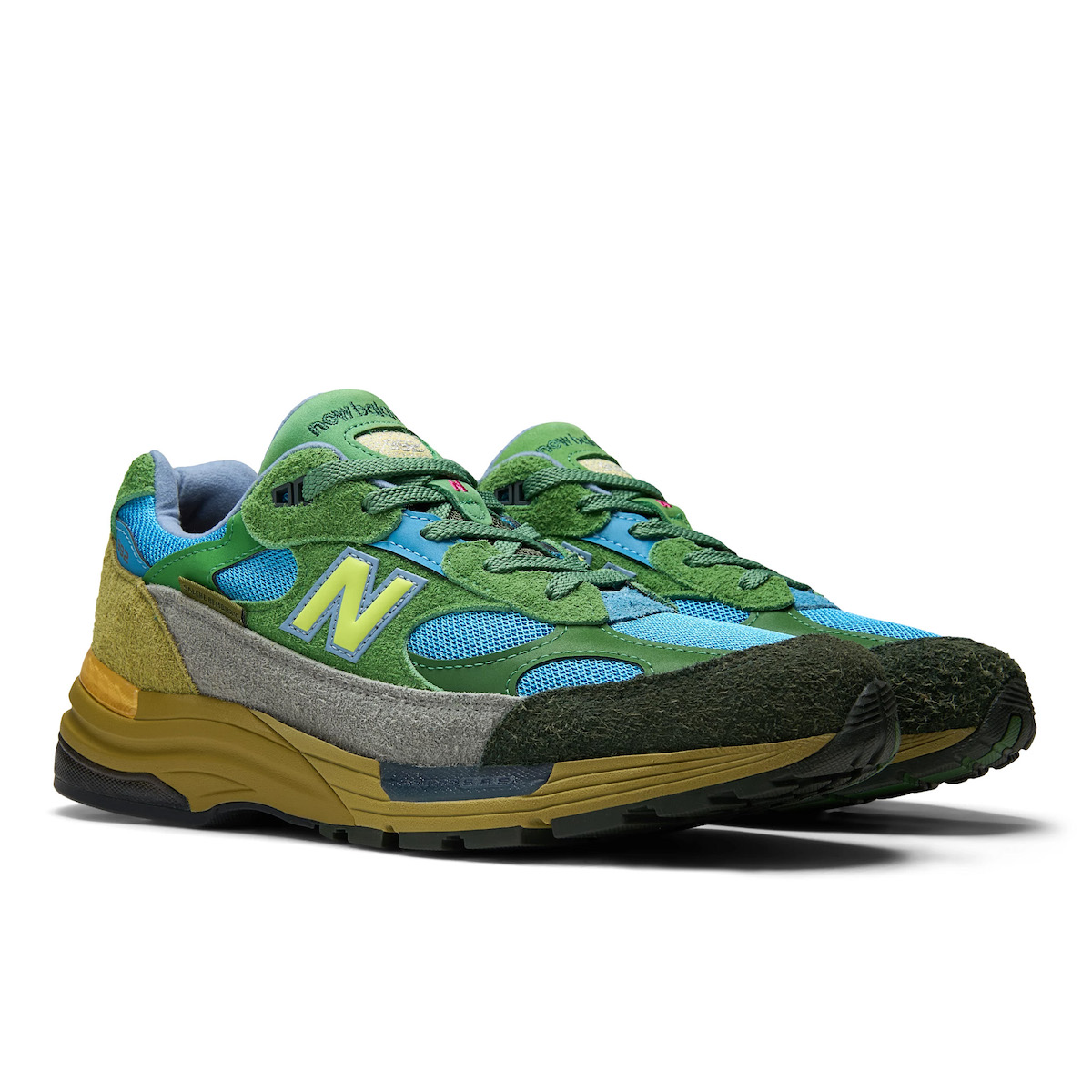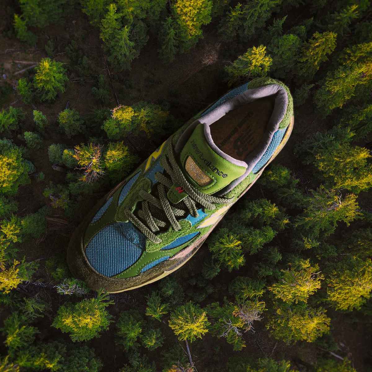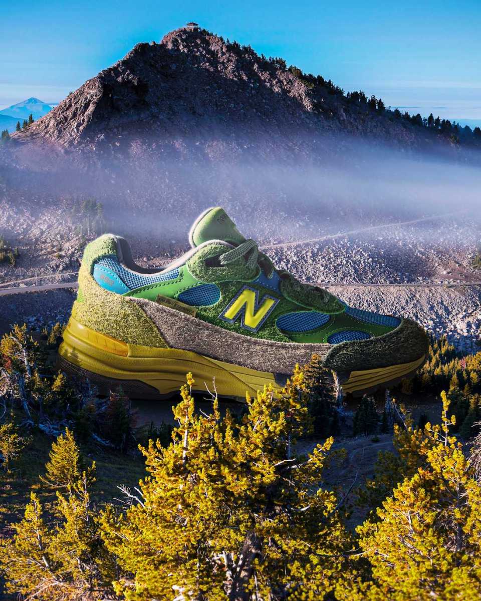 「ニューバランス」とサレヘ・ べンバリーは、これまで何度もコラボしてきたが、今回はアメリカ太平洋岸北西部に広がる氷河湖の深く澄んだ青い水と、それを囲む常緑のランドスケープに着想して制作した。そして、アッパーをヘアリースエードや合成素材など複数のマテリアルで構成することで多様な地形を表現したほか、コルク仕様のインソールには両者のロゴをあしらい、シューズボックスはスペシャルデザインとなっている。