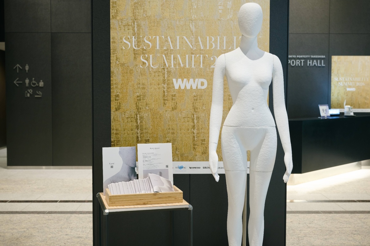 セッション2に登壇した「ダブレット」のブースでは、キノコの菌糸体由来の人工レザーや卵殻膜由来素材などを用いた歴代コレクションを、原料や素材サンプルとともに展示。革新的素材をユーモアへと昇華するデザインの背景を、視覚的・触覚的に体感できる構成となった。また、ホワイエのマネキンには彩ユニオンの「カミ トカシ」を採用。石油由来素材を一切使用せず、紙と木材、スチールのみで実用強度を実現し、使用後は分解してリサイクルやリユースが可能な設計となっている。展示空間そのものもまた、循環思想の実験場となっていた。