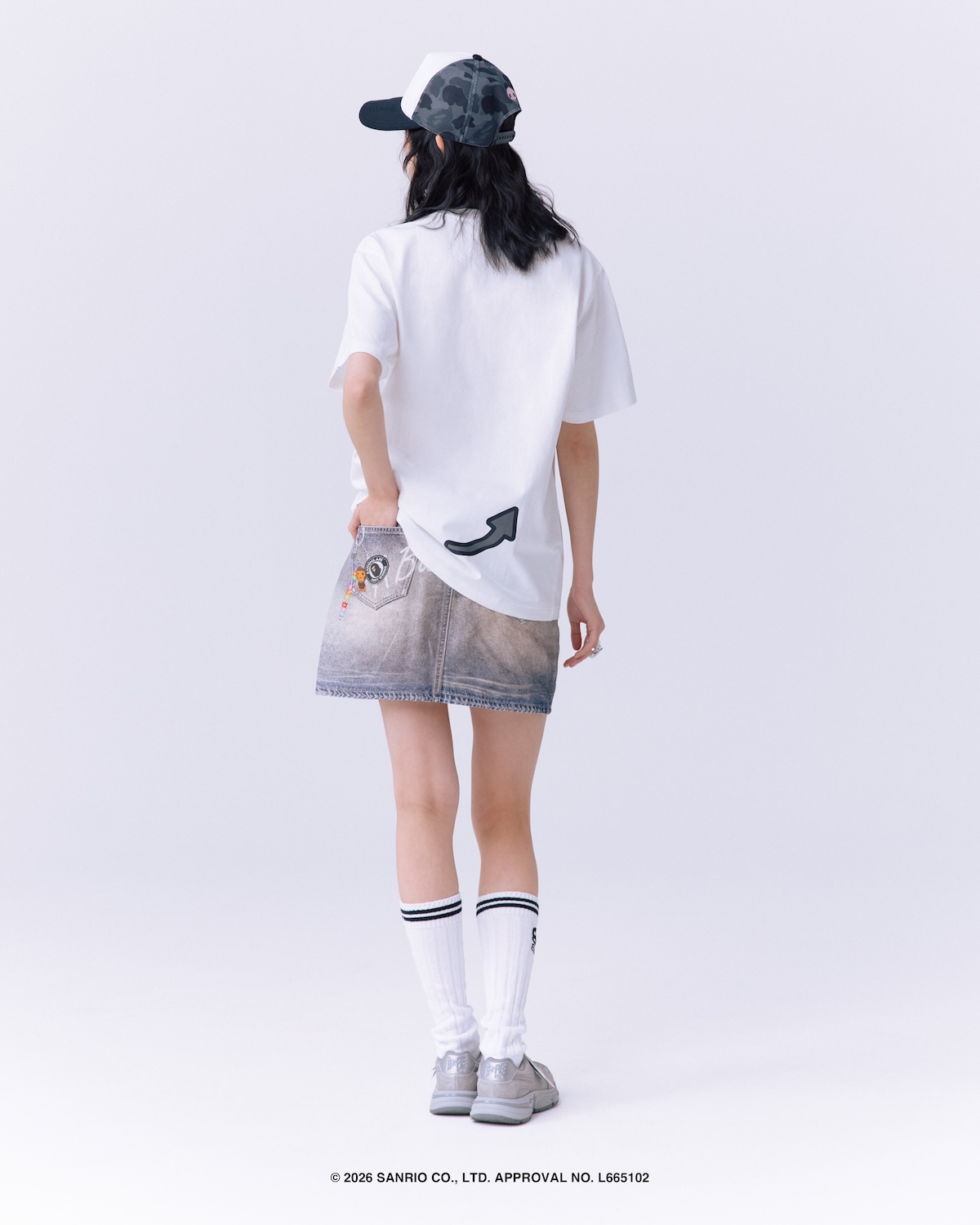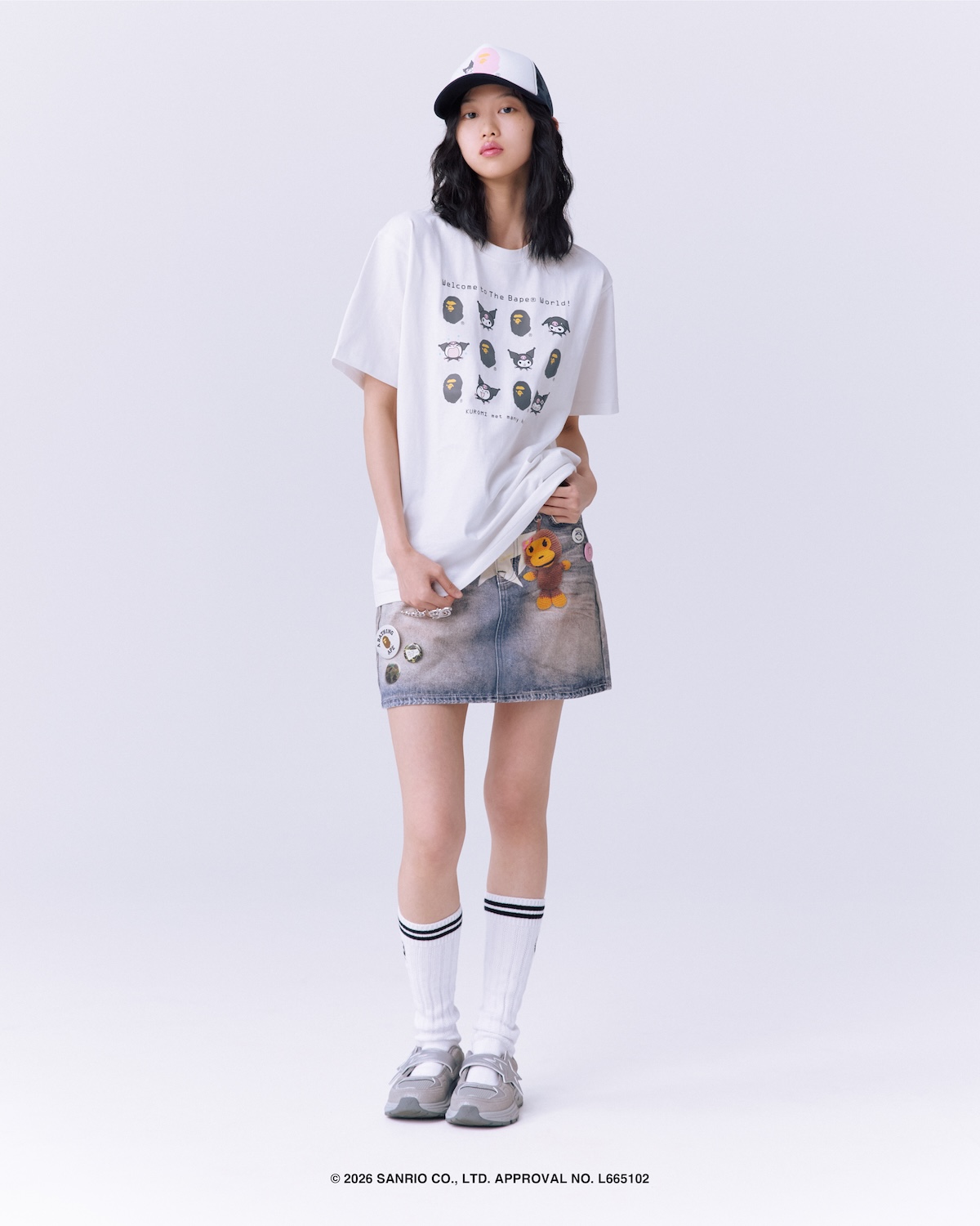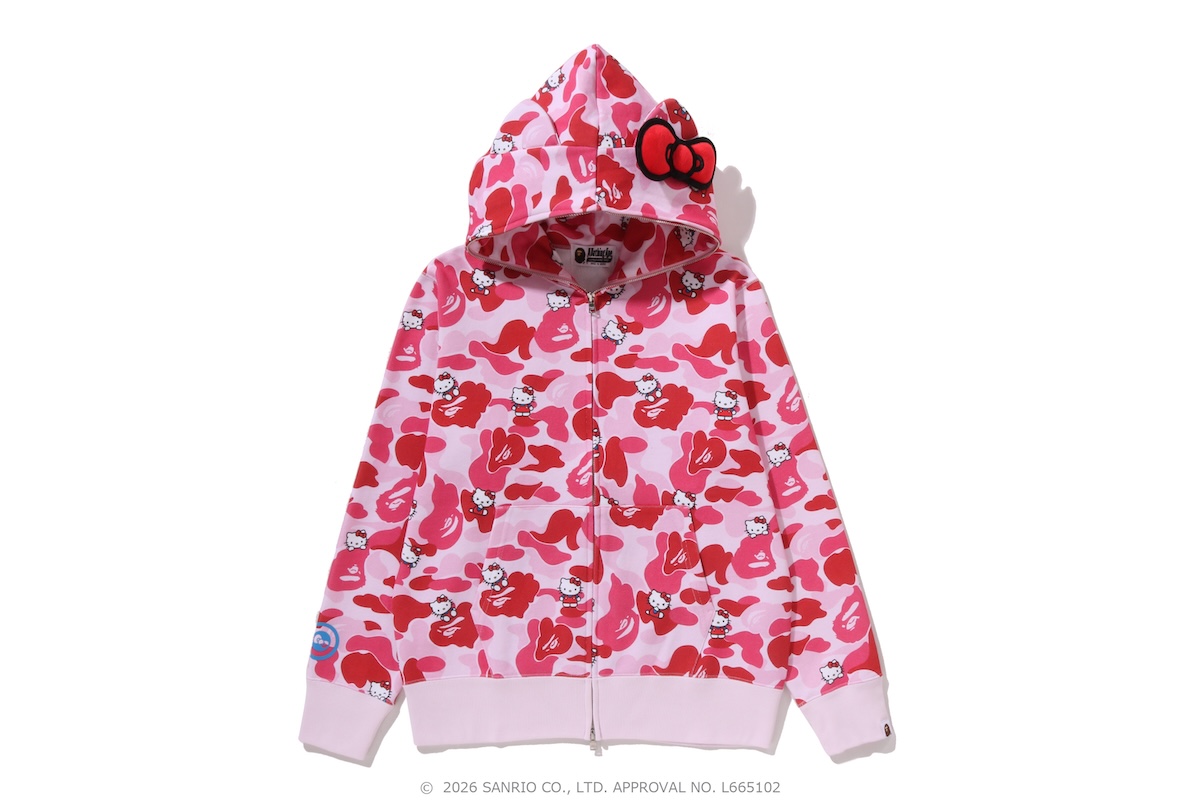 アイテムは、クロミとハローキティそれぞれを落とし込んだ2デザインを各型で用意し、“Welcome to The Bape® World!”のグラフィックがベースの “Tシャツ”(8800〜1万4300円)や、定番のカレッジグラフィックをベースに、キャラクターたちが遊んでいるようなデザインをあしらった“カレッジ ミニ Tシャツ” (8800〜1万4300円)、オリジナルカモフラージュを採用し、キャラクターになりきれる “フルジップフーディー”(3万800〜4万6200円)をラインアップ。さらに、定番のメッシュキャップに、“エイプヘッド”からキャラクターがのぞくデザインをあしらった“ABC カモ メッシュキャップ”(1万7600円)や、クロミ仕様にアップデートした“プラッシュドール”(1万7600円)、背面にキャラクターの尻尾を配した“プラッシュドール キーチェーン”(7700円)といった小物もそろえる。
