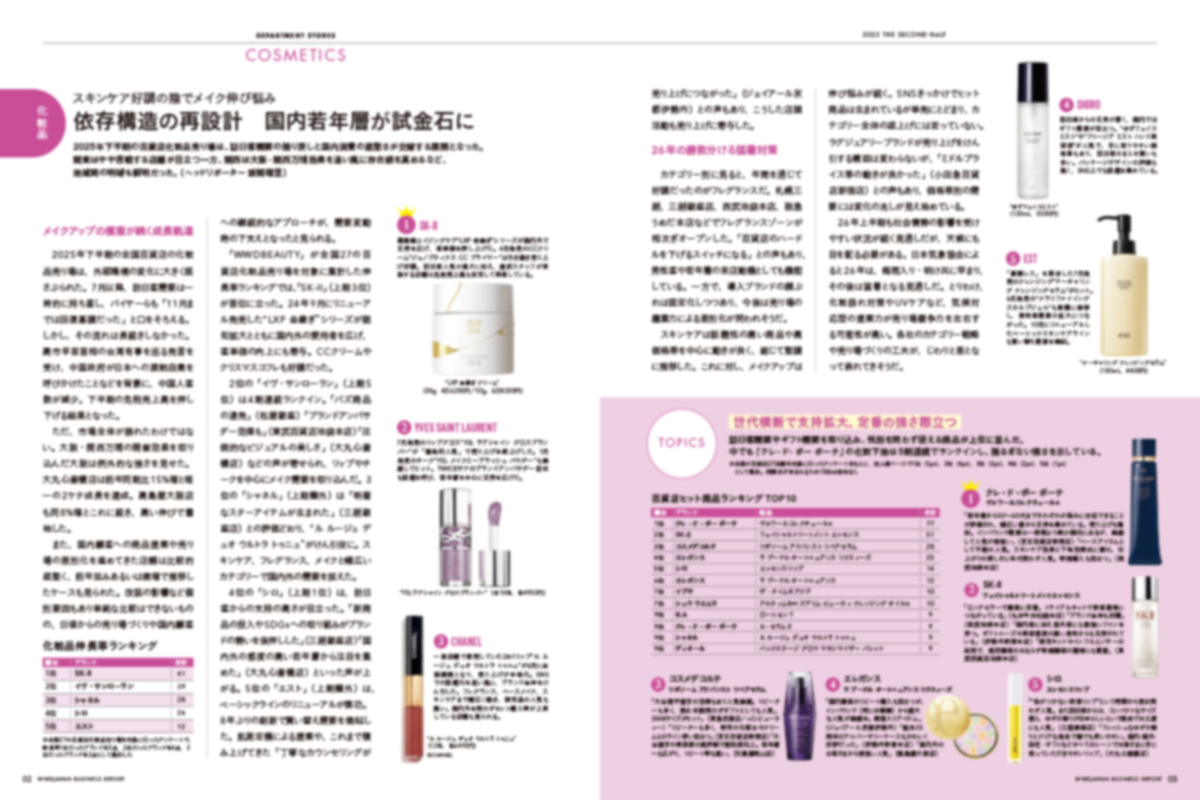 百貨店の化粧品、特選・宝飾売り場から、ルミネ新宿などのショッピングセンター、「ゾゾタウン(ZOZOTOWN)」、「セカンドストリート(2nd STREET)」や「メルカリ(mercari)」などの二次流通まで、さまざまな小売りの商況や顧客動向、売れ筋などを取材し、網羅しています。