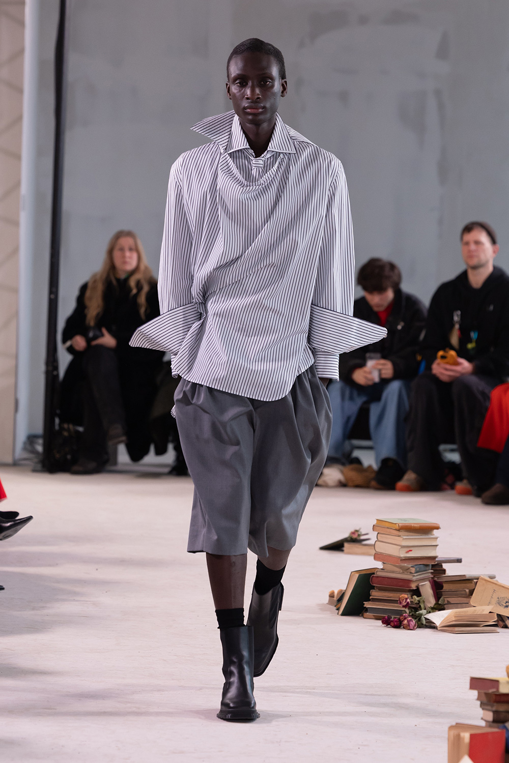2022年にケルンで創業した「マーケ」は、詩的なムード漂う美しいテーラリングに一層磨きをかけ、これまでで最も洗練されたコレクションを披露した。目を引いたのは、すっきりとしたテーラードコートやスーツ、流れるようなワイドパンツ、アレンジを効かせたシャツのレイヤード、チュールを重ねたバルーンパンツやボンバージャケット。メンズの仕立てを軸にしつつもジェンダーレスに着られるスタイルは、日本をはじめ国外のメディアやバイヤーからの評価も高く、ビジネスの発展に期待がかかる。