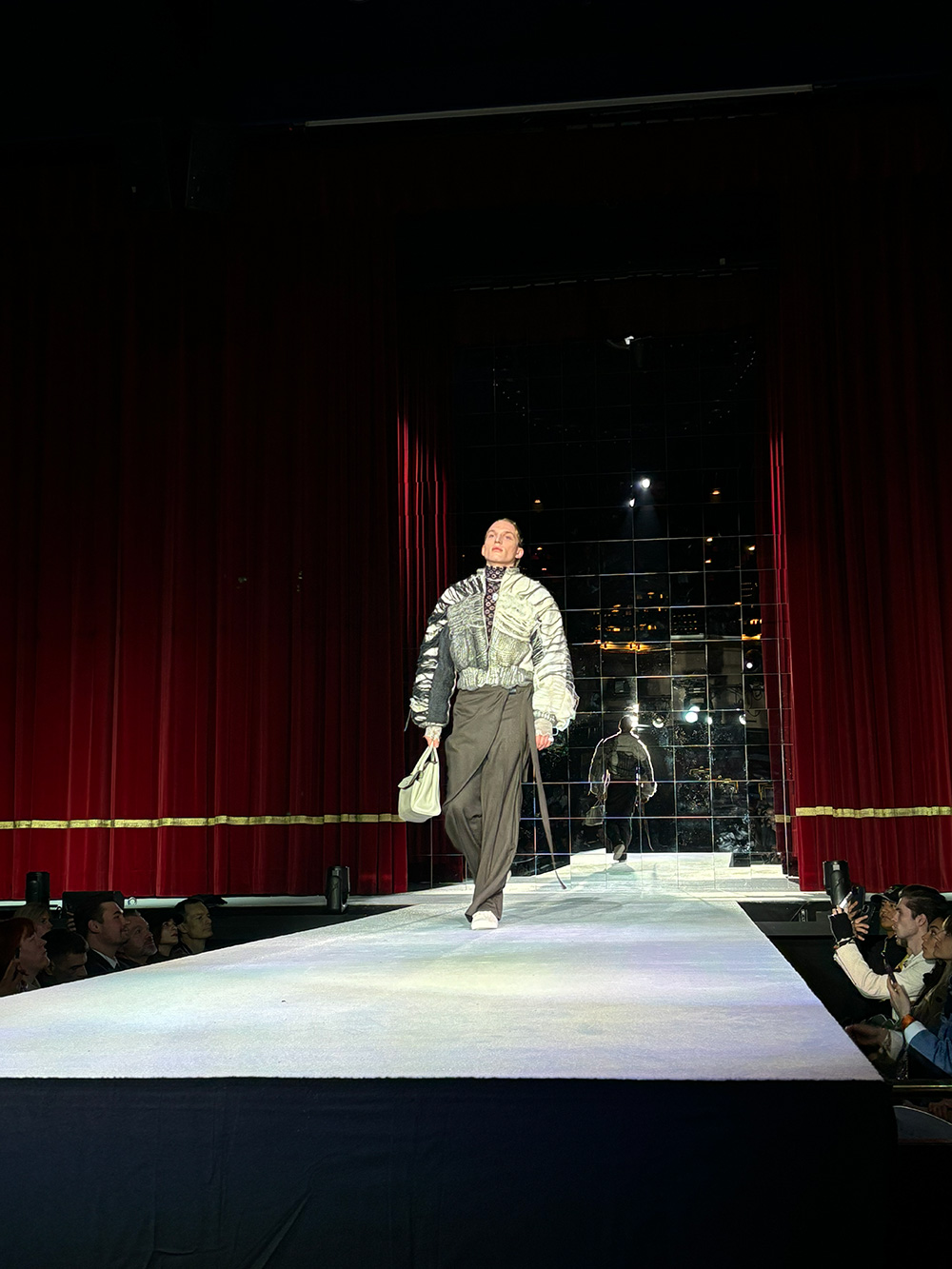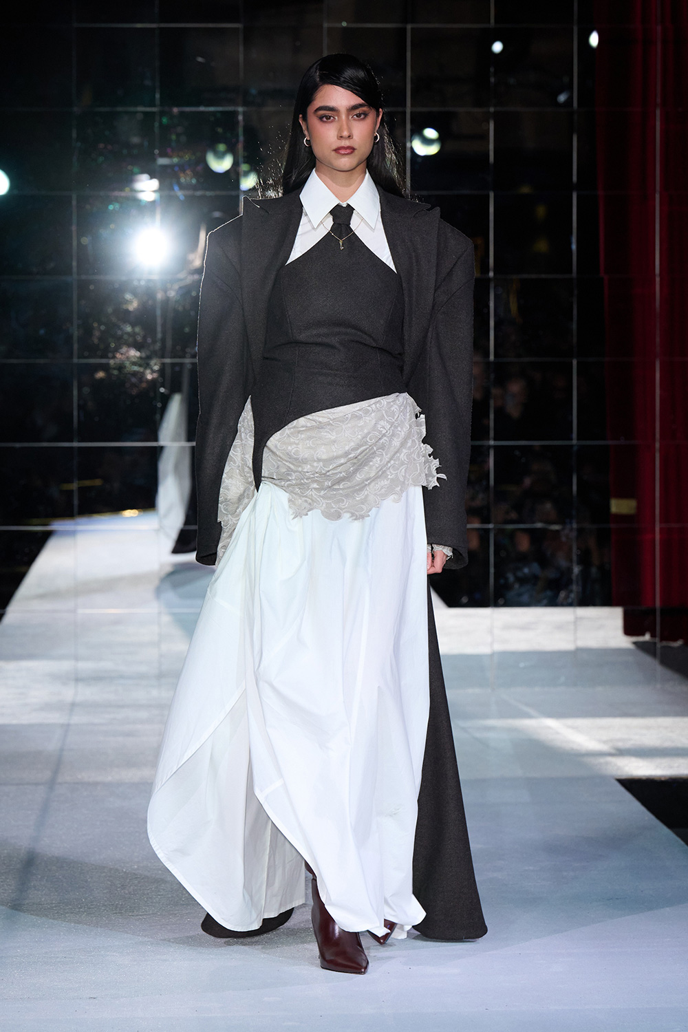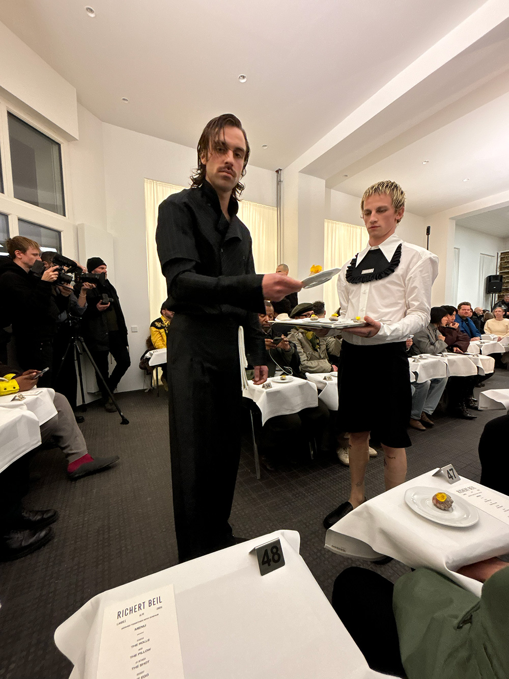 黒を基調にアングラかつ前衛的な世界観を追求する「リヒャルト バイル」は、新たに構えたスタジオ兼コミュニティースペースで、“ディナー”を交えた奇妙かつ親密なショーを開いた。一口サイズのコース料理を提供する給仕とモデルたちがまとうのは、シェフシャツやエプロン、メイド服のフリル、白いナプキンなど晩餐会につながる要素とテーラリングを融合したウエア。アイデアは奇抜だが、精緻な技術に裏付けられたクオリティーの高さが光る。