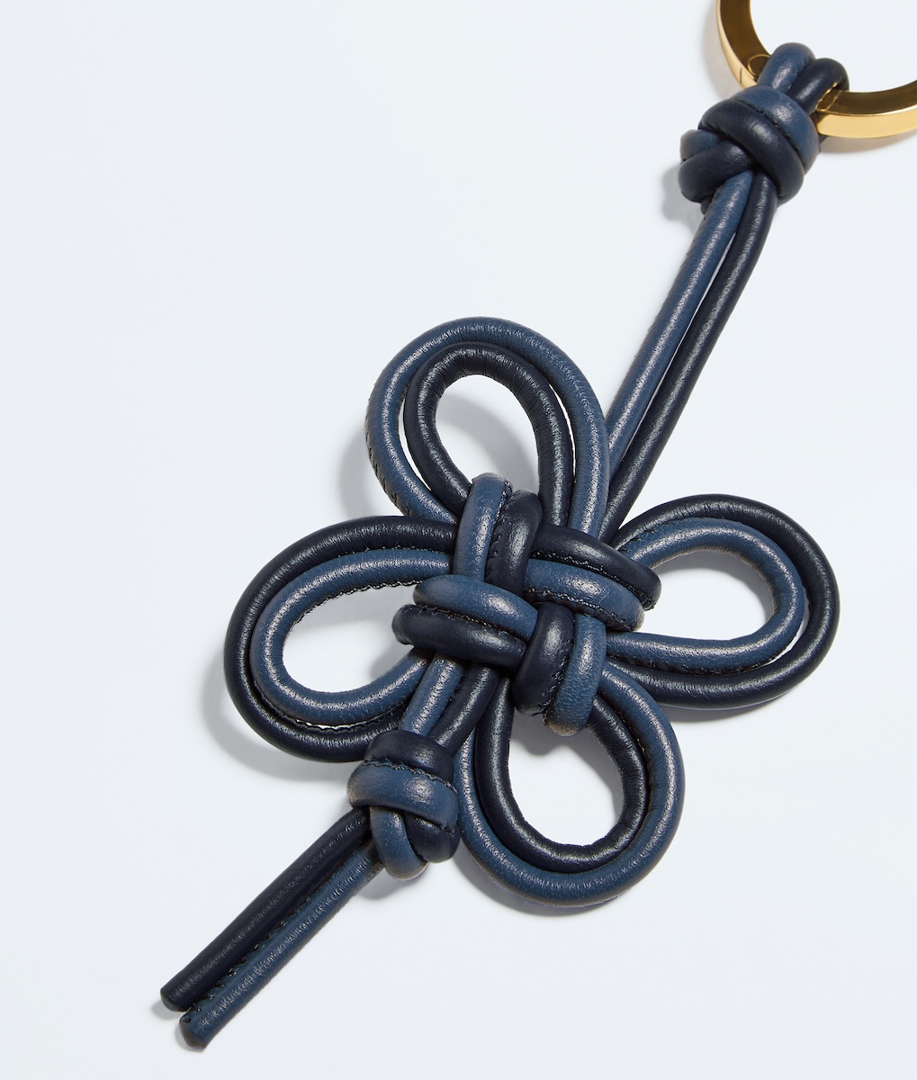 コントラストの効いた2色のグリーンのレザーチューブを用いたキーリング(7万400円)は、2本のレザーチューブを複雑に組み合わせ、四つ葉のクローバーを表現している。中国の伝統的な装飾結びに着想を得た。