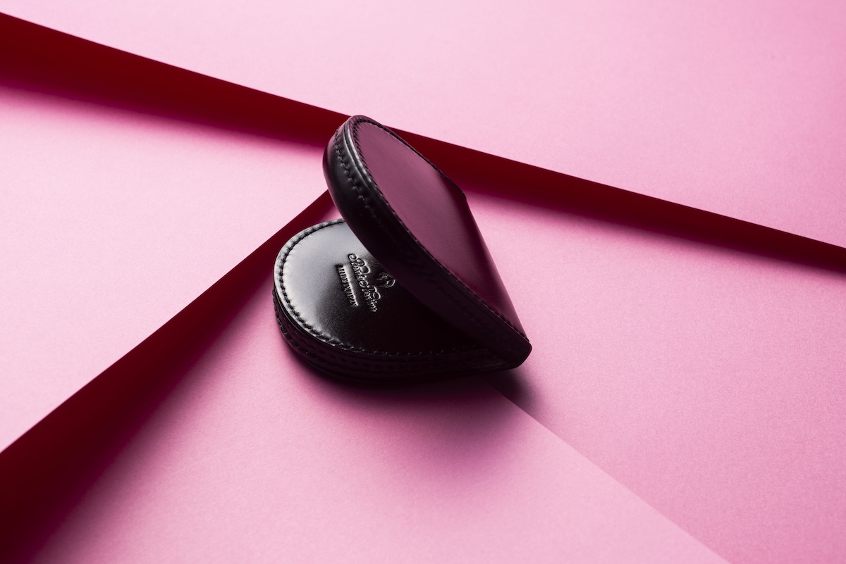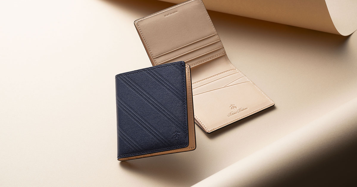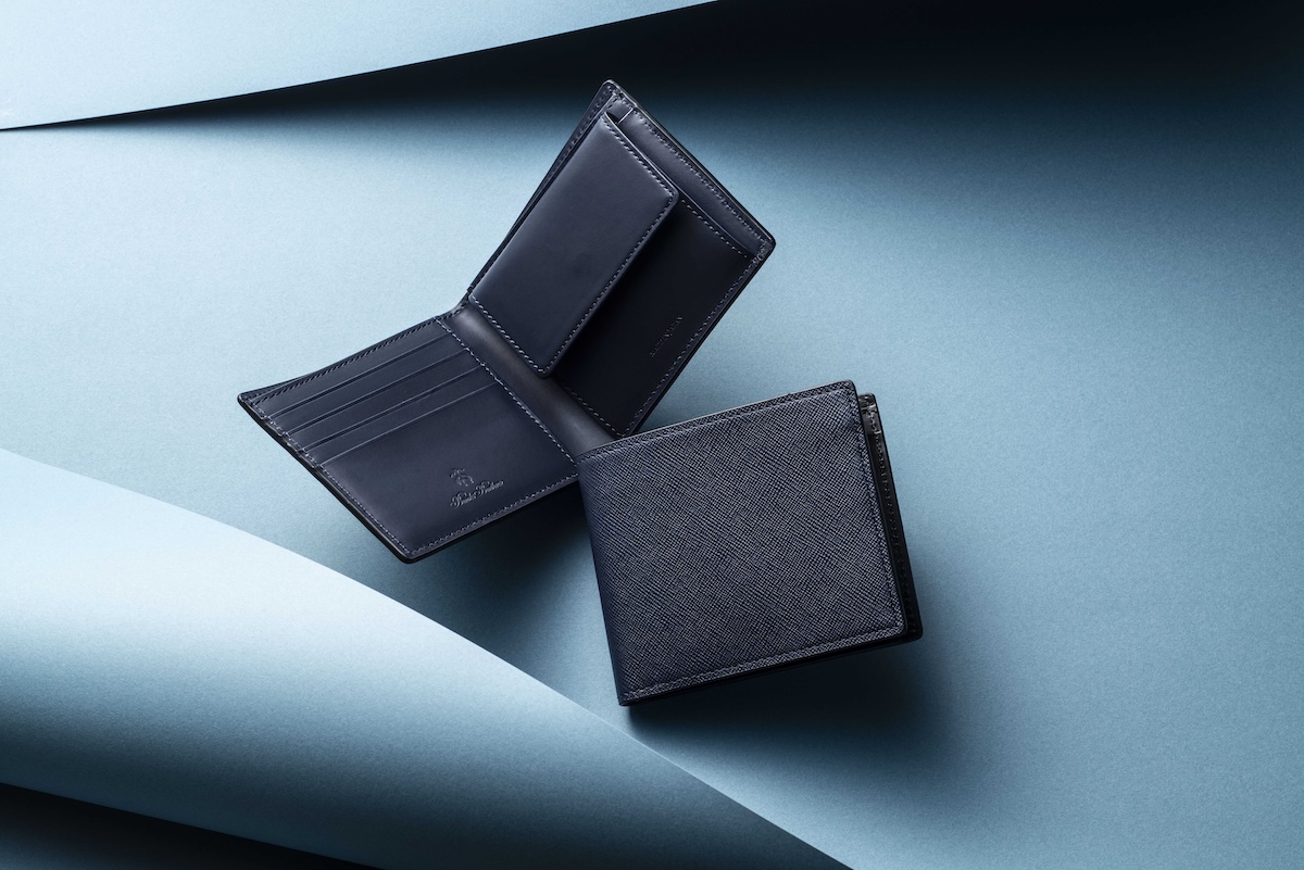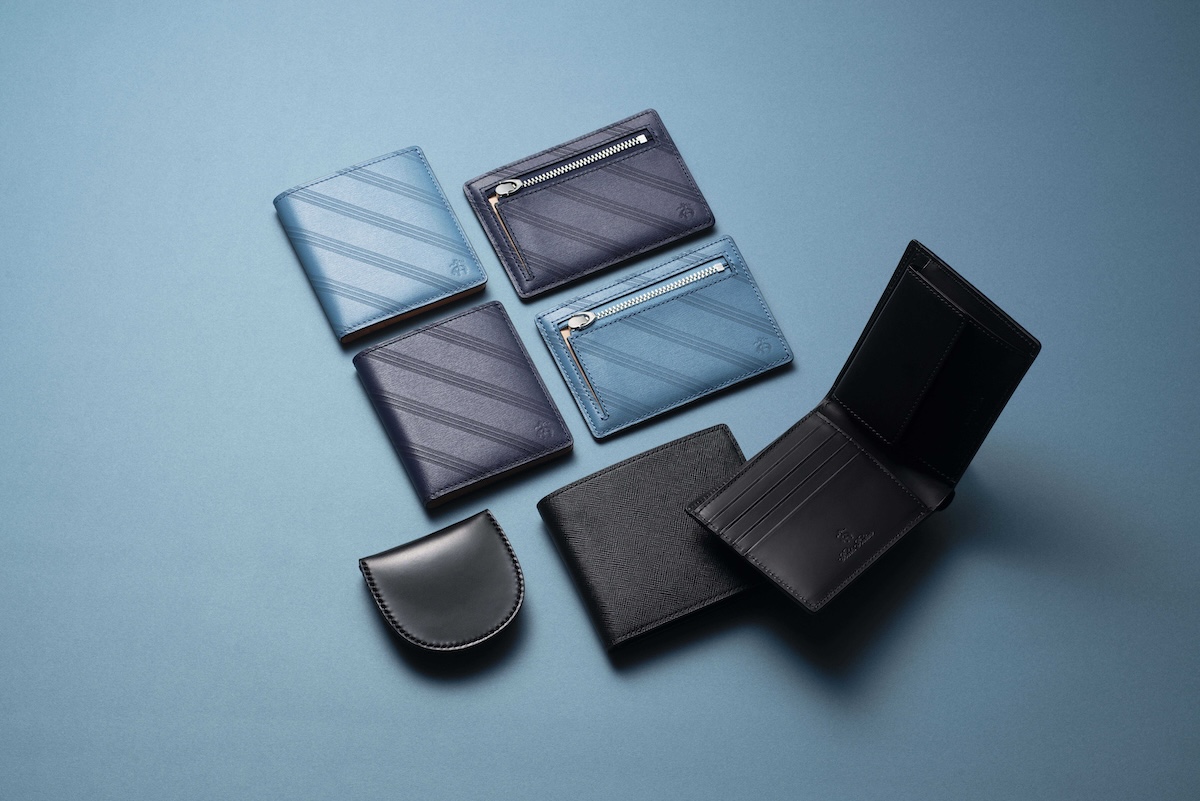 “コードバン コインケース”(3万800円)は一頭の馬からごくわずかしか採れないコードバン(馬革尻部)を使用したアイテムだ。開くとトレーを兼ねた蓋側にコインをスライドさせることが出来る実用性の高いデザインだ。“カウレザー 2フォールドウオレット”(4万1800円)は、BB#1(ナンバーワン)ストライプが型押しされたオリジナルレザーを使用した二つ折りのウオレットだ。6枚分のカードスロットと内側に札入れを備える。