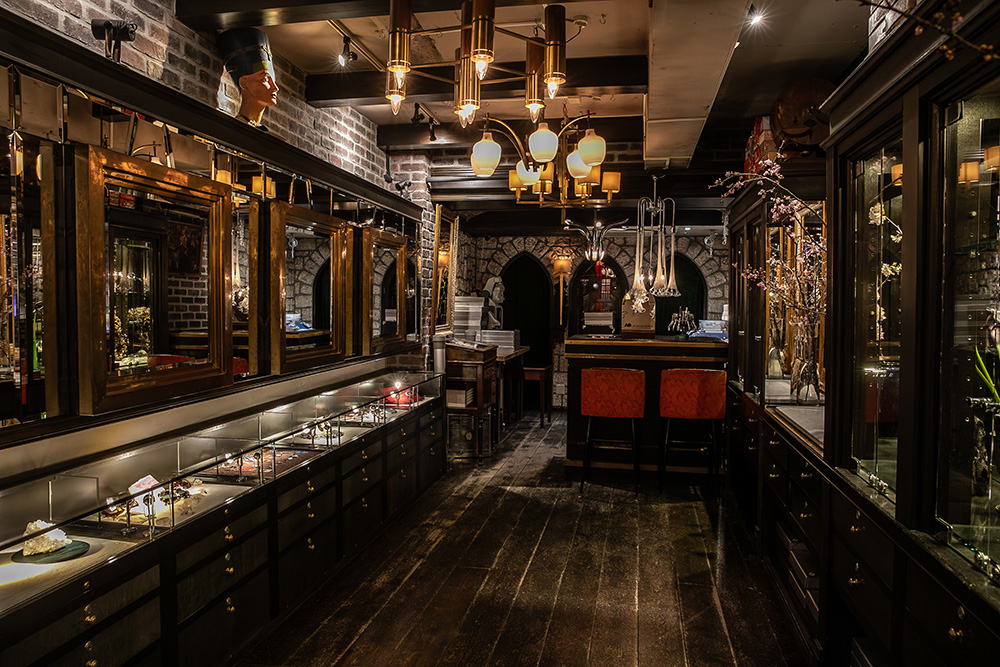 龍允代表は、「店舗は、洞窟みたいな場所。個人的な“洞窟体験”があったから」と話す。その体験とは、19、20歳のとき。それまでの交友関係を捨て、一人暮らしのマンションにこもり、小さなテレビでは昔の映画を、本では三島由紀夫などの「1960年代の前衛的なもの」に浸っていた頃を指す。龍允代表は、「あのときは友人とつながることを選ばず、歴史的にヤバいものに触れながら、無意識の何かに働きかけているような時間だった。ここは、そんな世界観を物理的に表現した店舗」という。「『何者でもないが、何者かになりたい』と思っていたとき、しかも世界的にも歴史的にも通用する『何者かになりたい』と思っていたころ、強烈に惹かれたのが(現在扱う)アイウエアやジュエリーだった。歴史をたどれば、人間は昔から神に近づくため、美しい石のマジカルなパワーに惹かれている。1つのモノとしてスゴいエネルギーが凝縮されているものを考えたとき、ファッションの世界ではアイウエアがキラーアイテムだと思った。パーソナルで、人間の内面的な何かにリンクする」。これが、「ソラックザーデ」がビンテージアイウエアを専門とした理由だ。