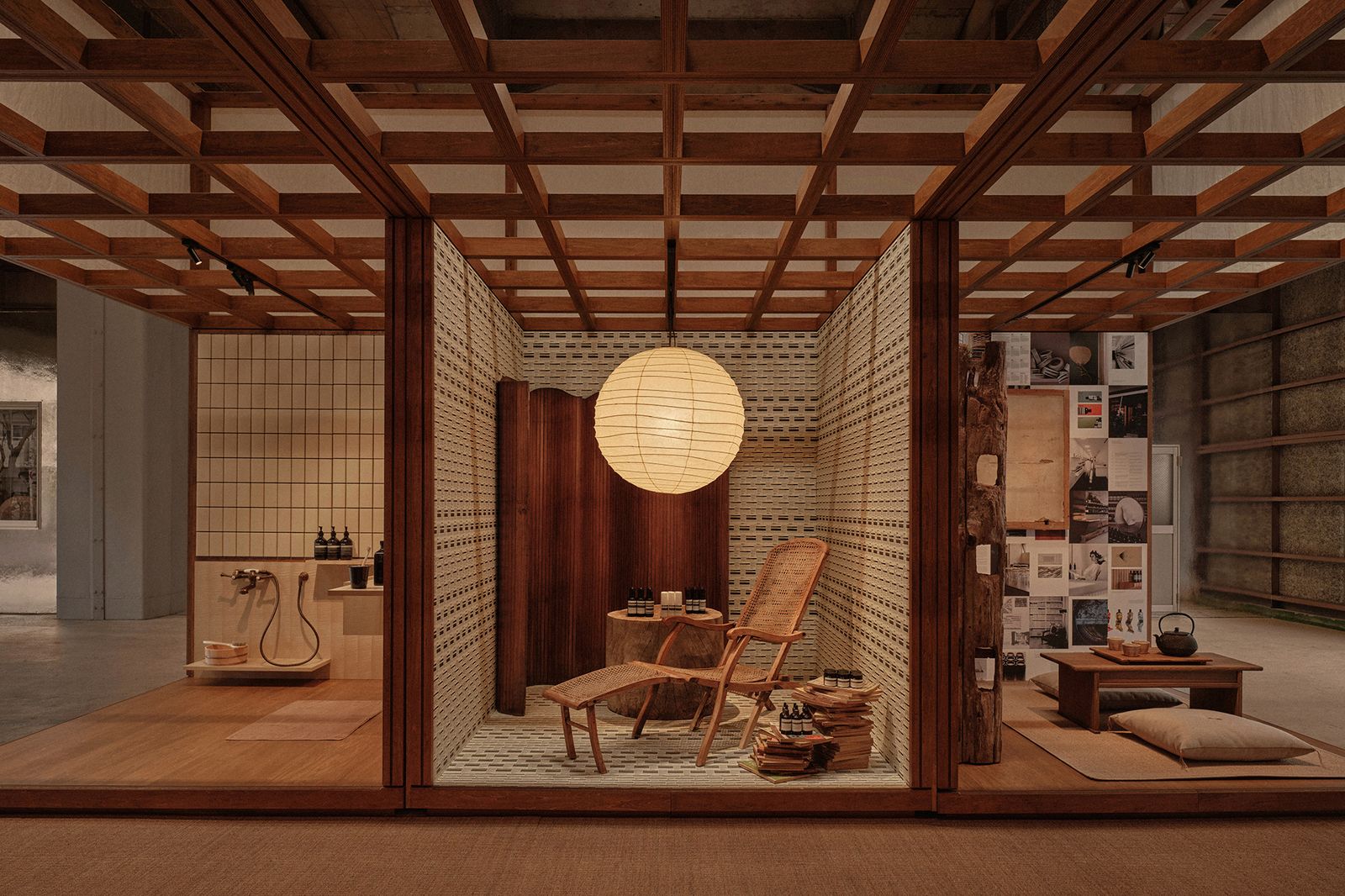 会場は、小津安二郎監督による映画「お早よう」(1959年)に登場する住空間の表現からインスピレーションを広げ、居間、浴室、台所など昔ながらの日本家屋の情緒を再解釈した空間が広がる。映画のセットのように連なるそれぞれの空間の中には、まるでレンガの壁のように並ぶバーソープや壁一面に貼られた商品のラベル、調味料のように並んだスキンケアアイテムなど、「イソップ」の製品やフィロソフィーが混ざり合う。