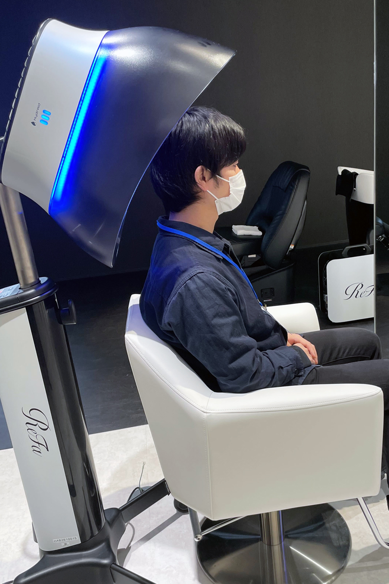 “リファハイドレイド”は浸透促進機で、従来のスチーム機より微細な水分粒子が毛髪のキューティクルの隙間から内部に入り込みコルテックスまで作用する。①カラー剤の色持ち向上、②トリートメントの手触り向上、③縮毛矯正が柔らかく仕上がる、の3点を特徴とする。使用方法は「薬剤の放置時間中に当てるだけ」とし、放置時間を仕上がり価値につなげる提案を打ち出した。空気中の水分を利用するため給水不要で、「コンセントに挿してすぐ使用できる設計」としている。