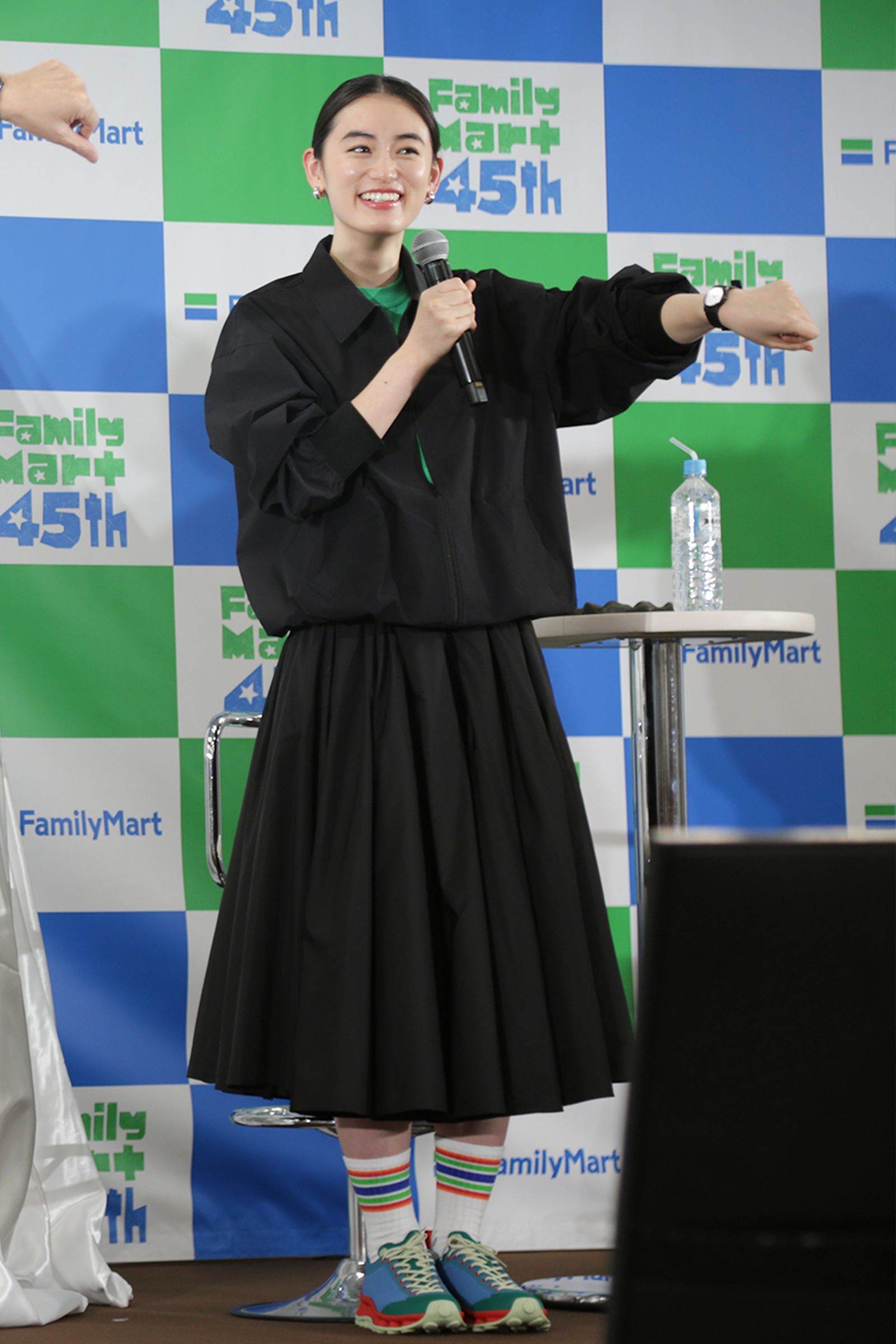 新作の中でも注目は腕時計。小ぶりなサイズ感で、フォーマルにもカジュアルにも対応するシンプルなデザインが特徴だ。吉田は「ベルトの一部がファミマカラーになっていて、とてもかわいいんです。短針が青やグリーンになっていて、色のアクセントもすてき。コンビニが時計を売るなんて、常識を覆されますよね」と笑顔で語った。このほか、ソックスやハンカチも45周年を記念した限定デザインで展開。2人は実際にハンカチを手に取ったり、足元を見せたりと、その魅力を訴求した。