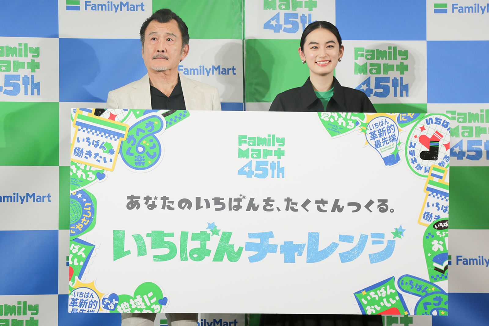 ファミリーマートは2月26日、創立45周年の事業戦略を発表する「ファミリーマート45周年プロジェクト発表会」を開催した。アンバサダーを務める俳優の吉田鋼太郎と八木莉可子が、「コンビニエンスウェア(CONVENIENCE WEAR)」の2026年の新作をまとって登場。吉田はブラックの半袖シャツを、八木はブラックのパーカを着用したスタイリングを披露。八木は「肌寒い日にコンビニで手軽でこんなにかわいいのが買えるってうれしいですよね」とアピールした。