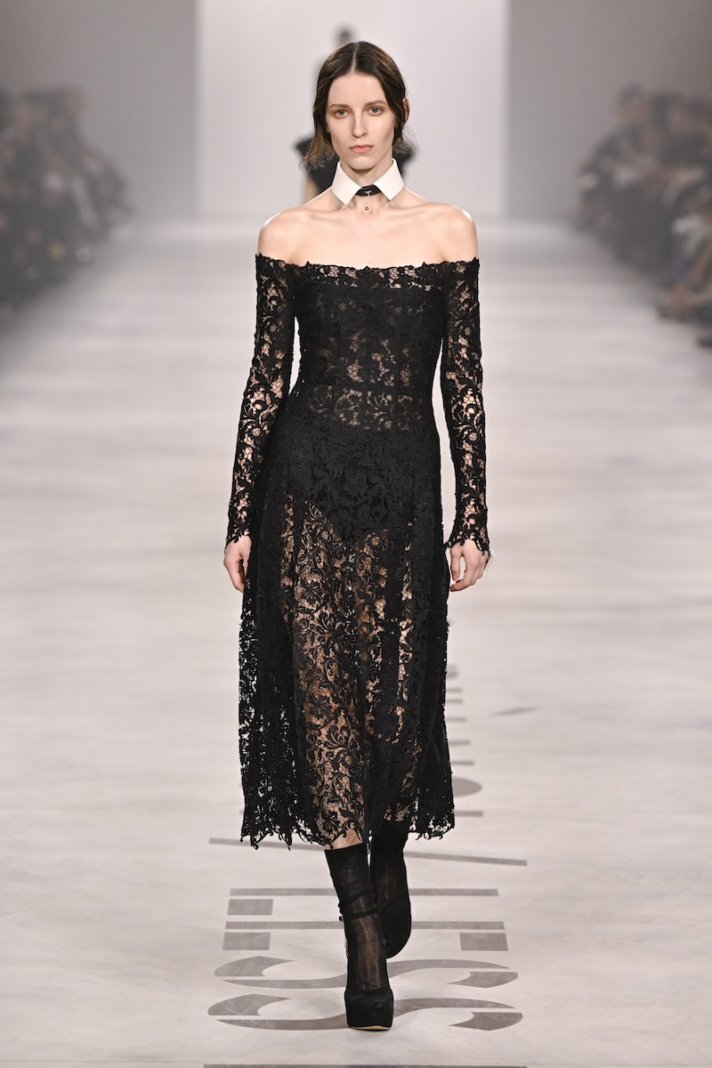後半を華やかに盛り上げたドレス群。黒のレザードレスは、まるでレースのように繊細な花模様が透け、フェミニンな甘さを残しながらも、クラフツマンシップの強度で観客を圧倒した。