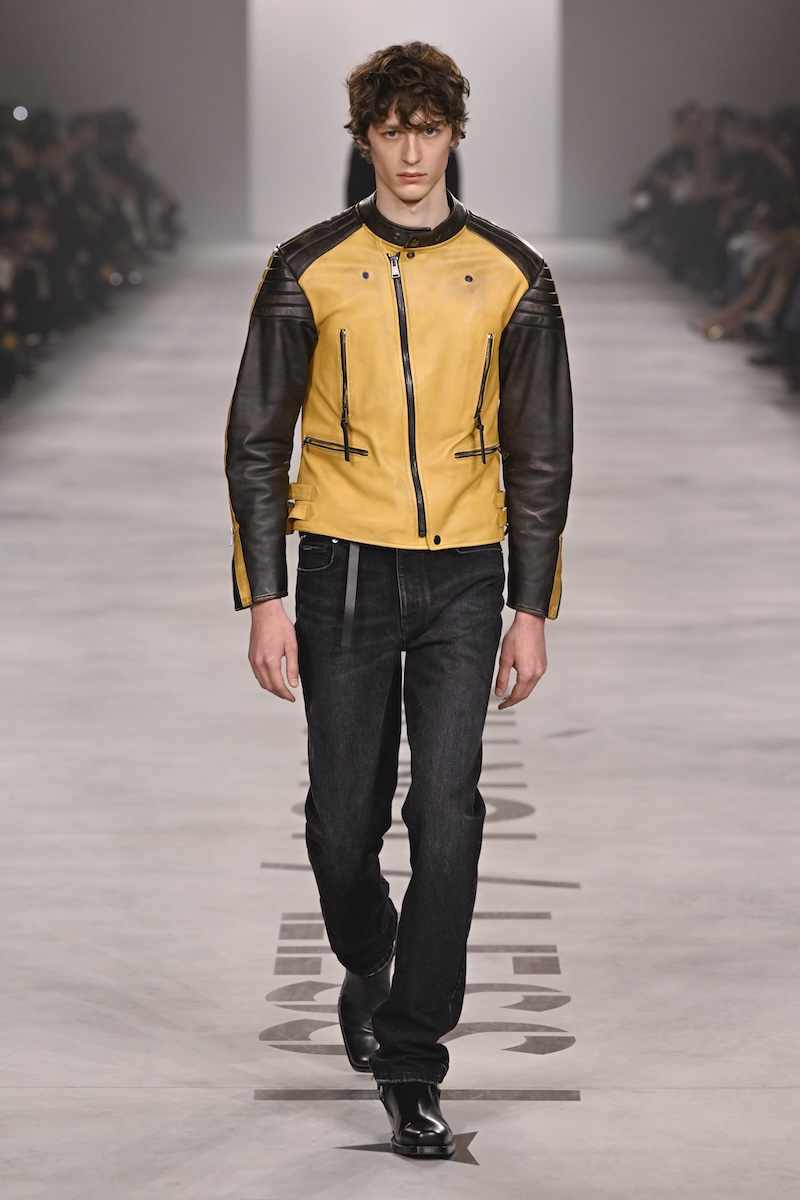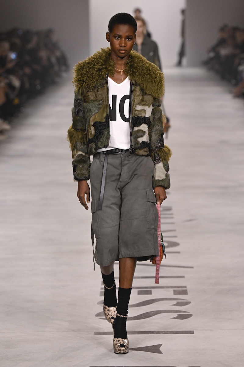 強い人物像は、レザーライダースやデニム、カーゴバミューダパンツなどのワークウエアでも一貫する。フットボールスカーフやTシャツに載る言葉は、イタリア人の女性アーティスト、サグ・ナポリ(SAGG Napoli)の作品だ。「根ざしているが、とらわれていない(Rooted but not stuck )」「存在しているが、依存していない(Present but not dependent )」「Loyal but not obedient (忠実だが、盲従ではない)」「Committed but not consumed(献身的だが、消費されない)」といった言葉は、「Less I, more us」を宣言したキウリの目指すシスターフッドのあり方、そして今後のメゾンのチームのあり方を示す。