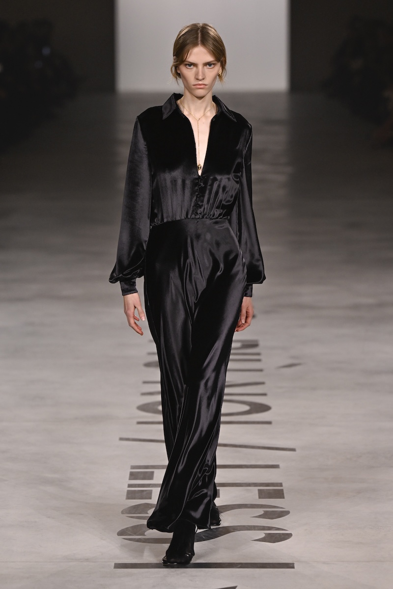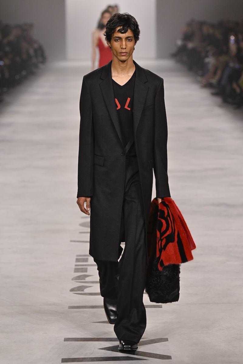 ただ、性別を強調した“女性像“と表現するよりも、“人物像“とした方が、正確だろう。黒のダブルブレストに淡いブルーシャツのスタイリングはメンズにもそのままシンクロさせ、あくまでジェンダーを問わない、現代の日常着として主張する。メゾンの原点であるファーコートは、日常着の延長として差し込まれていく。ファーは古い毛皮を解体し再構築するリモデルに職人技を生かしている。