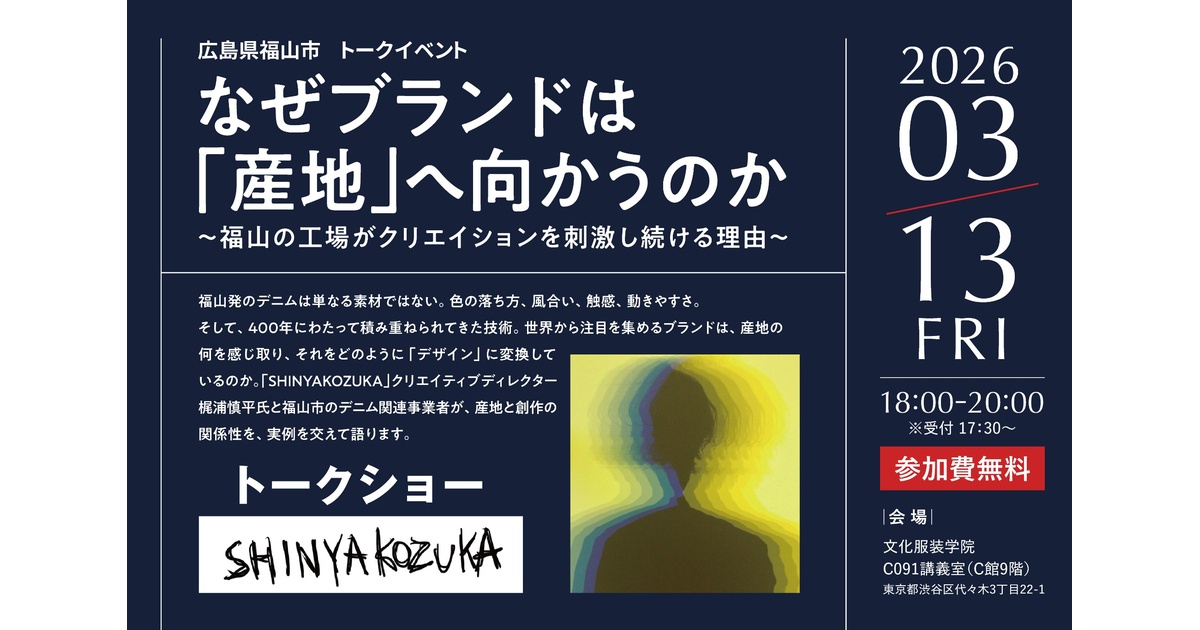 広島県福山市は3月13日、メンズブランド「シンヤコヅカ(SHINYAKOZUKA)」の梶浦慎平社長兼クリエイティブディレクターを迎え、トークイベント「なぜブランドは『産地』へ向かうのか 〜福山の工場がクリエイションを刺激し続ける理由〜」を東京の文化服装学院で開催する。福山市のデニム関連事業者とともに、ブランドが産地に見出す価値や、それをいかにクリエイションへ昇華しているかを探る。