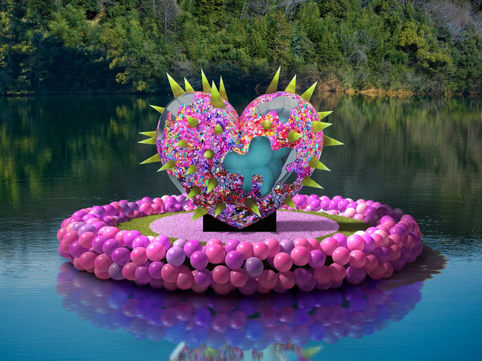 会場の象徴となるのが、宮沢湖に浮かぶ巨大作品「KAWAII-CORE ISLAND」だ。高さ6メートル、幅7.5メートルの“棘で守られたハート”が鎮座するピンクの島は、まさにKAWAIIの聖地。内部に入ることも可能で、鑑賞者はアーティストからの問いを受け取る。上陸には当日販売のボートチケットが必要となる。