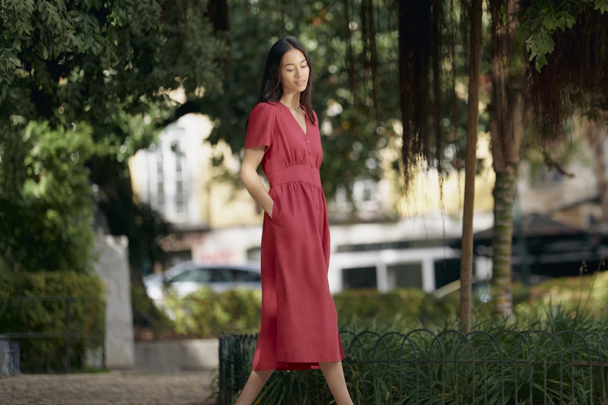 本コレクションでは、地中海沿岸のリゾート地・リヴィエラのエネルギーと色彩に着想を得て、素材とカラーにこだわった。アイリスブルーやベリーレッドをキーカラーとしたウィメンズ10アイテムを展開する。清涼感のあるストレートパンツ(4990円)をはじめ、1枚でスタイリングが完成するVネックワンピース(5990円)やジャンプスーツ(5990円)など、リネンを使用したアイテムを用意する。カラーバリエーションが豊富なTシャツ(2990円)は、リネン特有の軽やかなドレープと快適な質感が楽しめる。