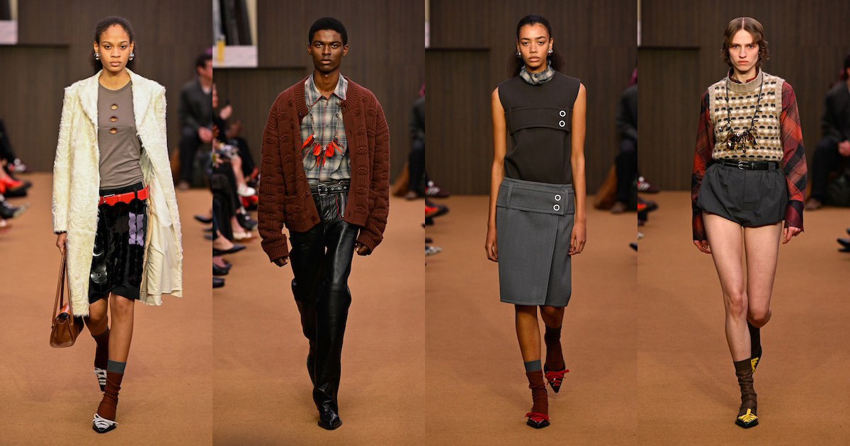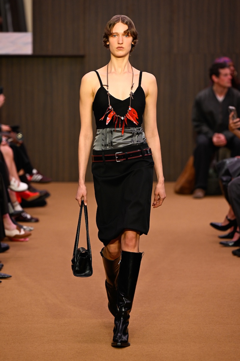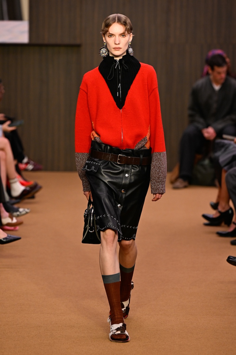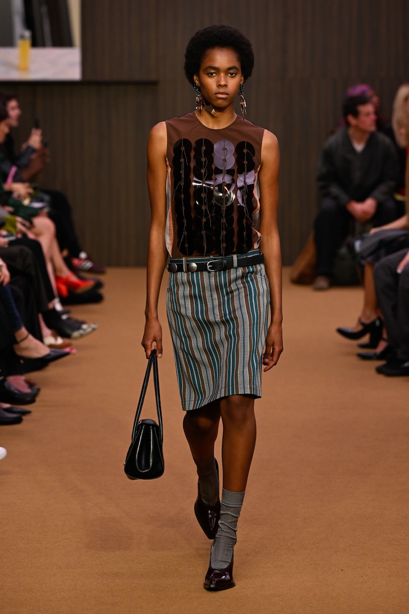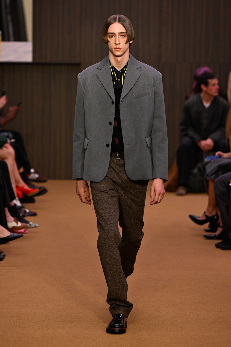 太いベルトが印象的なローウエストのスタイル、大ぶりのスパンコール、弛ませたソックスとキトゥンヒールのフットベッドサンダル、そして胸元のコスチュームジュエリー……。フランチェスコの在任期間中は、コンスエロの娘のカロリナ・カスティリオーニ(Carolina Castiglioni)による「プラン C(PLAN C)」などに食指が動いていた往年のファンには、メリルのクリエイションは改めて「マルニ」に興味を抱かせる大きな契機になるだろう。腰履きするスカートから覗くのは、ブラトップとレイヤードしたペチコート。メンズでは、上下でピッチが異なるストライプのシャツ&パンツ、同じく色の異なる生地によるジャケパン、タイドアップしたシャツに厚手のカーディガンを合わせたり、クロシェ編みのようなベストには膝丈のシャツをコーディネートしたり。最初はポジティブだったか、いつの間にかシリアスやスピリチュアルなアート志向に傾倒して、派手なのに「遊び」のムードが感じづらくなっていたフランチェスコのクリエイションからの転換を印象付け、改めて自由奔放に着こなす楽しさを発信した。一方、メリルのレトロな色使いや、古着を思わせる生地選びなどは、新しい顧客を開拓しそうな気配がある。グランジやウエスタン、グランパなど、さまざまなテイストを融合する様は、若手らしいリミックス感の表れ。「愛着」や「長年愛用し続けたが故の痕跡」に価値を見出した2026-27年秋冬メンズのムードとシンクロする。