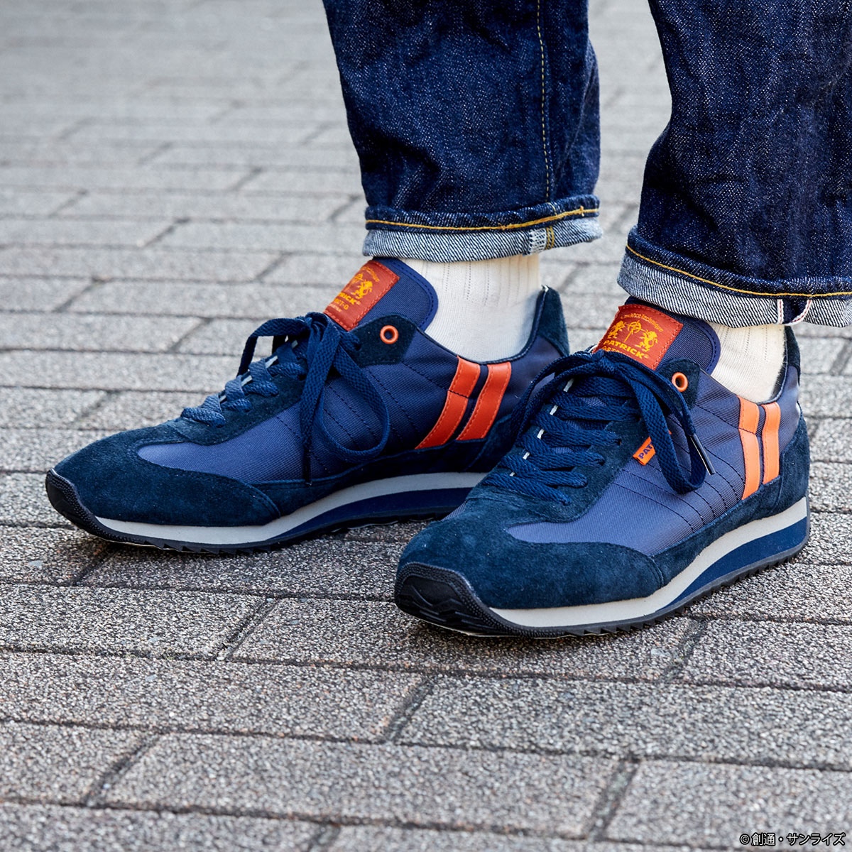 同アイテムは、軽量でクッション性に優れた履き心地が特徴の「パトリック」を代表するモデル“マラソン”をベースに採用し、ナイロンとスエードでやや丸みのあるフォームとトゥが巻き上がったドライビングシューズのようなアウトソールに仕上げた。ネイビーベースの本体にオレンジのラインを配したカラーリングと踵に施した“マフティーマーク”の刺しゅう、シュータンのオリジナルネームで映画の世界観を表現した。