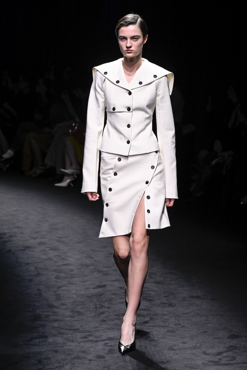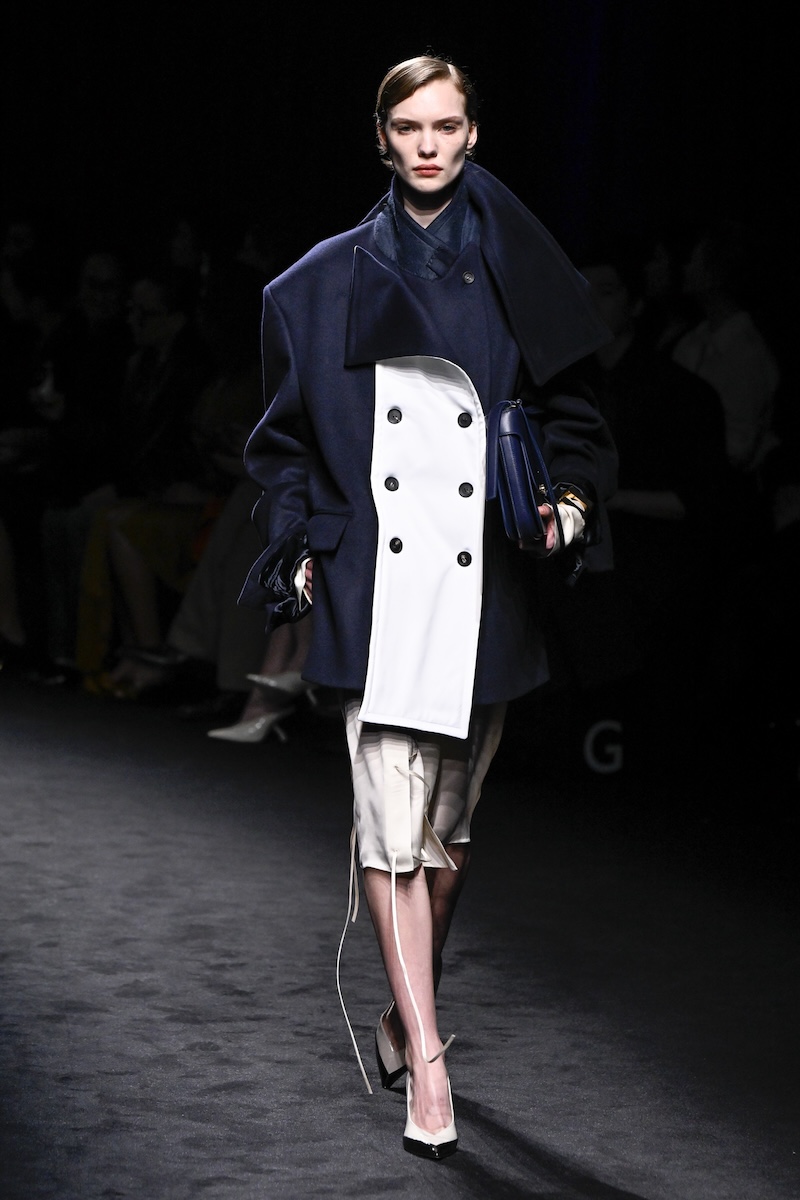 ファーストルックのネイビーのピーコートは、肩幅を大胆に張り出し、彫刻的なオーバーサイズにアレンジした。フロントにはサイズの異なる白のパネルを差し込み極端に強調する。ピーコートを出発点にしながら、海軍のコードは徐々に「ボタンの配列」へと集約されていく。彫刻的なアウター群で印象付けた2列のボタンは、ニットの肩へ移り、スカートには斜めに走る。秩序の象徴的ディテールを、留め方次第で着る人がシルエットを変形できる「自由」の仕掛けとして再配置した。