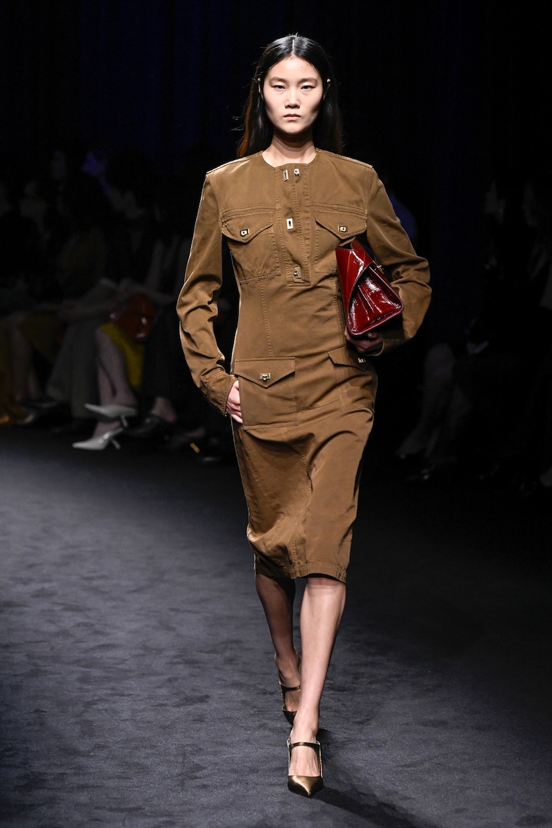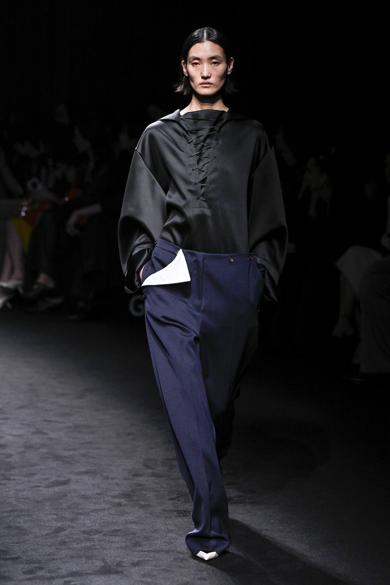 迫力あるアウターとは対照的に、海軍シャツを連想させるレースアップのトップスは、とろみのあるオフホワイトのサテンで表現し、ミリタリーの文脈に、ラグジュアリーなナイトウエアのような色気を忍ばせる。セーラーのディテールを残したサテンのドレスには、アーカイブに着想したヴァンプの深いピンヒールを合わせ、イブニングスタイルを完成させた。