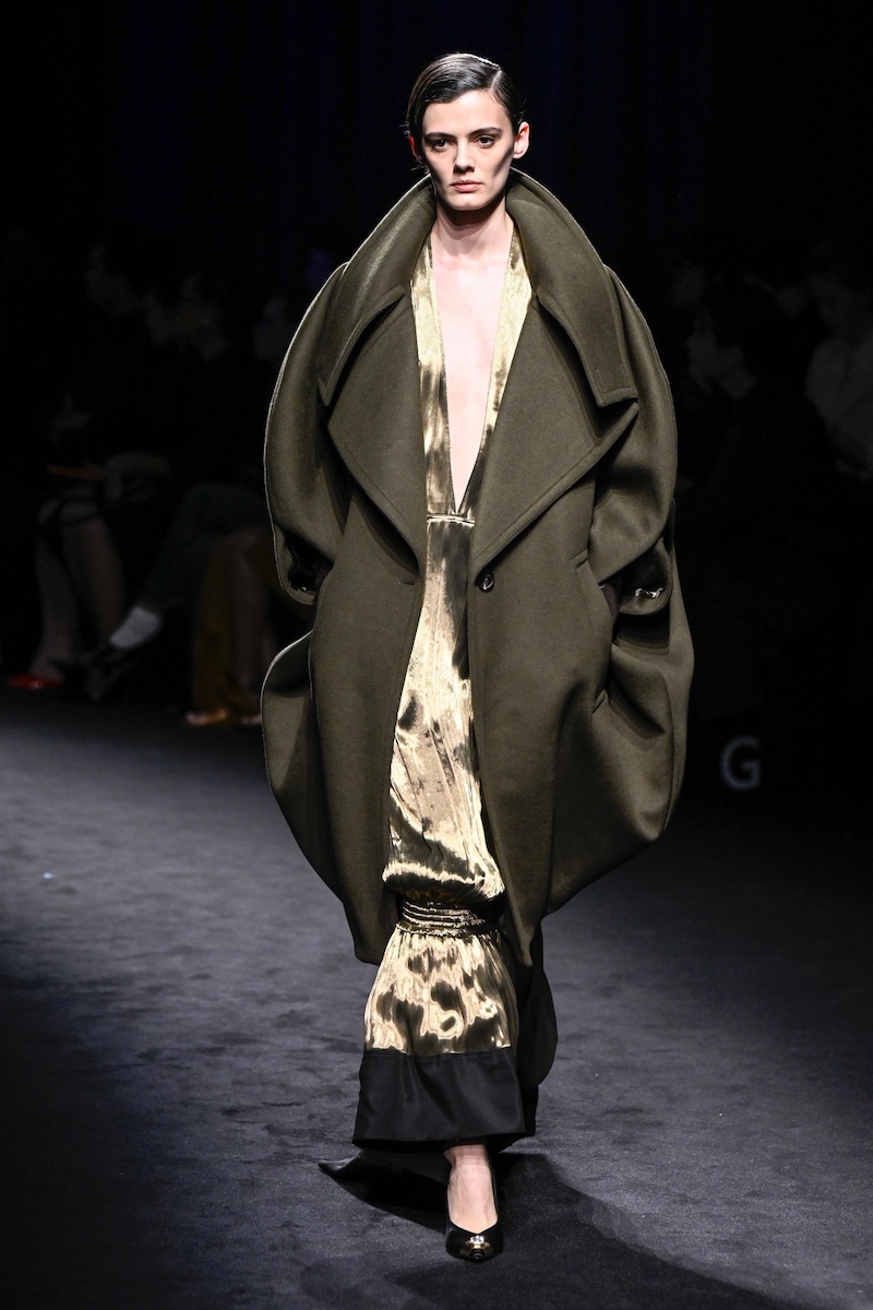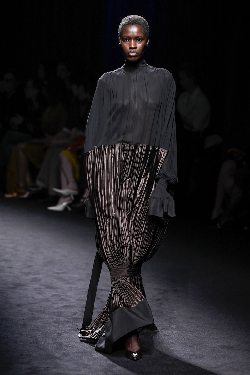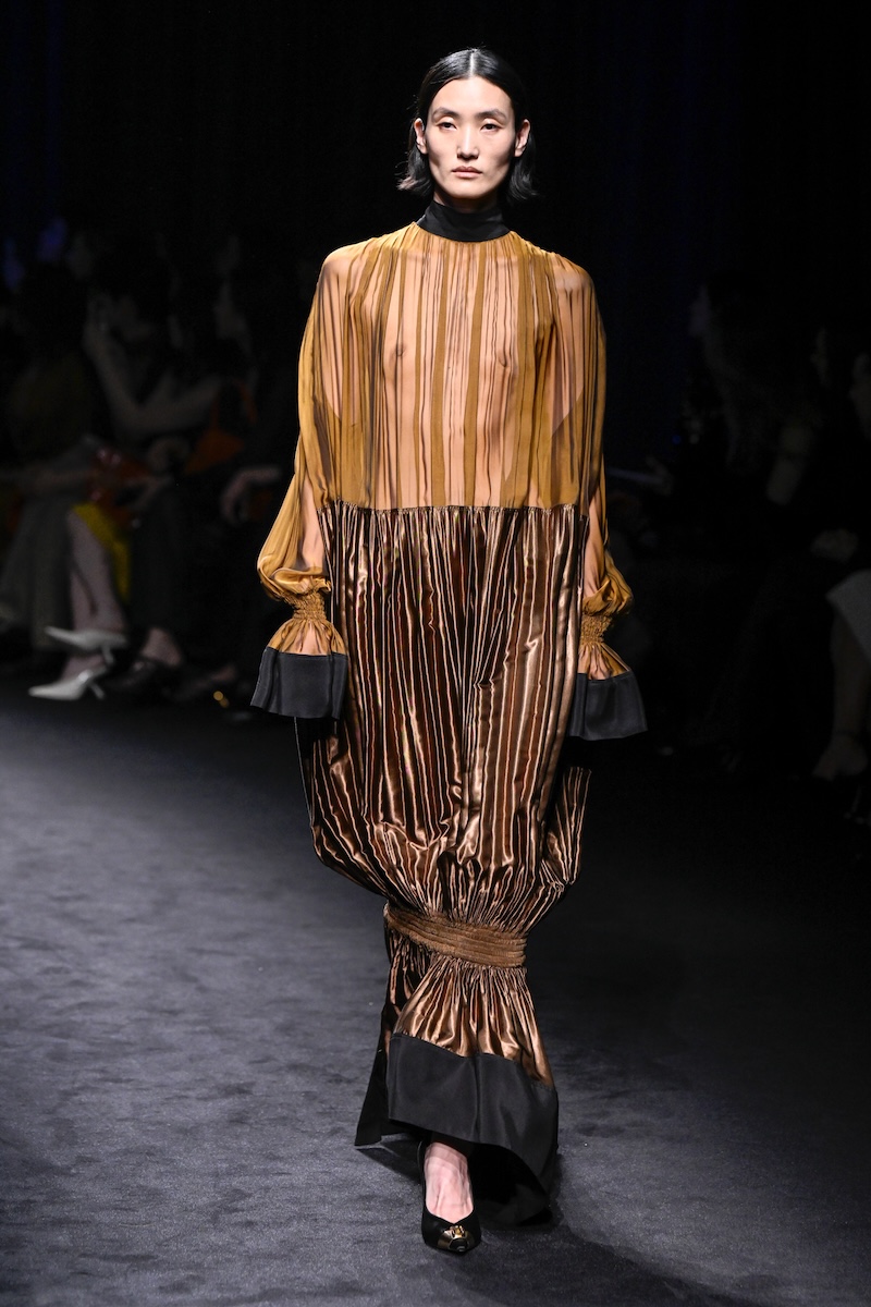 フィナーレを盛り上げたのは、シアーシフォンに細かなプリーツを走らせたコクーン型のドレス。彫刻的なアウターとは異なるアプローチで、立体的な迫力を見せた。