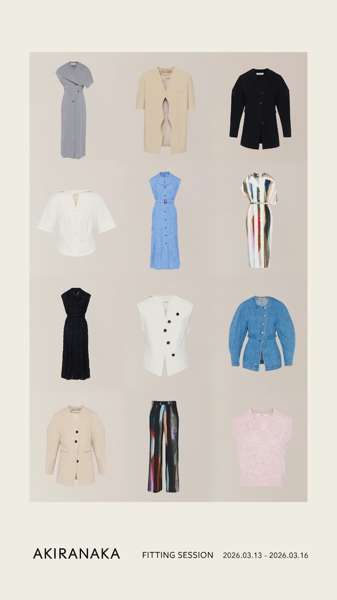 「アキラナカ(AKIRANAKA)」は3月13〜16日、期間限定のフィッティングイベント「アキラナカ フィッティング セッション」を東京・駒場東大前のハレトケ ギャラリー(HARETOK GALLERY)で開催する。