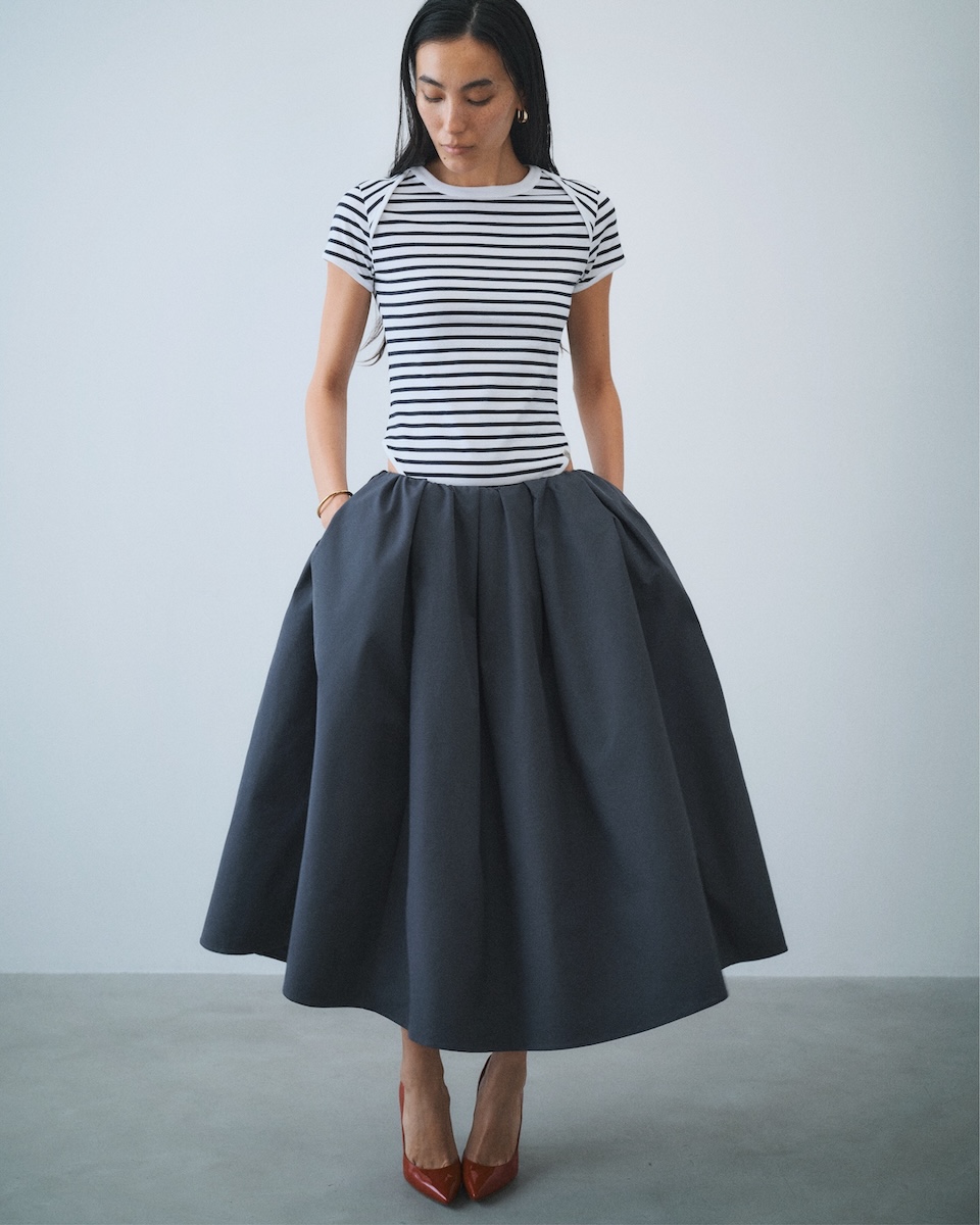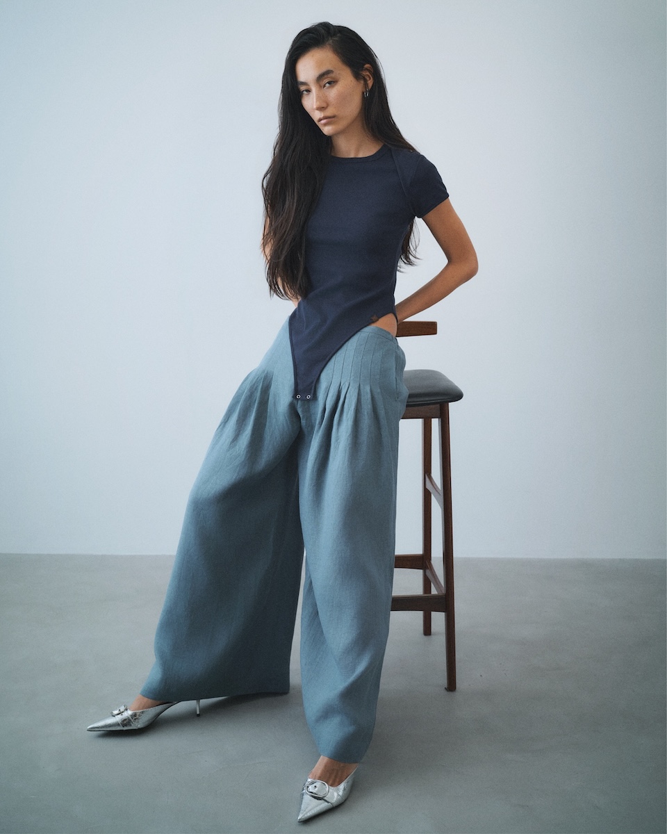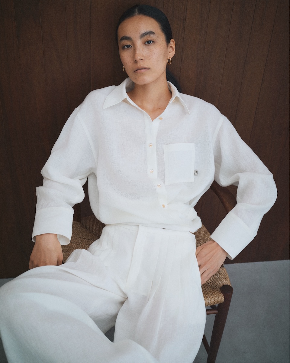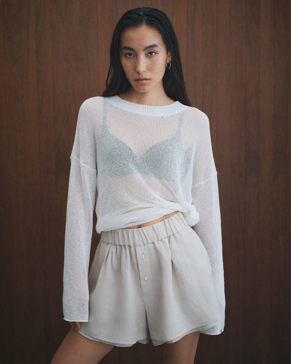 セカンドコレクション「MOOD.02」は、自由にニューヨークを旅する女性のワードローブをイメージした。 “リネン メッセージ ラップ シャツ”(4万2900円)、“リネン リラックス ドレス パンツ”(5万3900円)、“シアー タイ ニット”(2万8600円)、“ジョガー タック パンツ”(4万2900円)などをラインアップする。