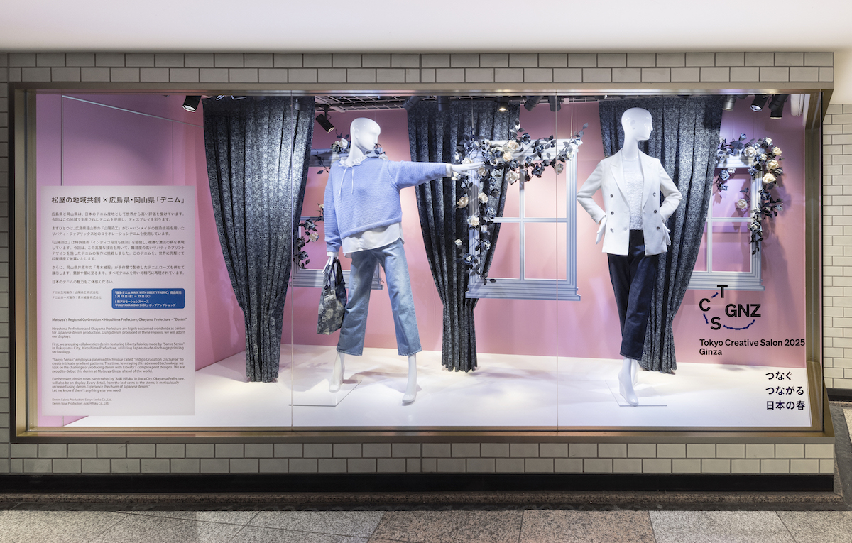 松屋銀座は、東京のさまざまなエリアを舞台にしたクリエイティブの祭典「TOKYO CREATIVE SALON 2026」(以下、TCS)の一環として、3月11~24日にイベントを開催する。日本各地の伝統工芸や産業、文化とデザインを結びつけて、銀座からその価値を紹介する取り組み「松屋の地域共創」として、広島県福山市のデニムと群馬県桐生市の刺しゅうを使用したディスプレーを制作。ショーウインドーや店内装飾など館内全体を通じて、日本のデニムとモノ作りの魅力を体感できる場を届ける。