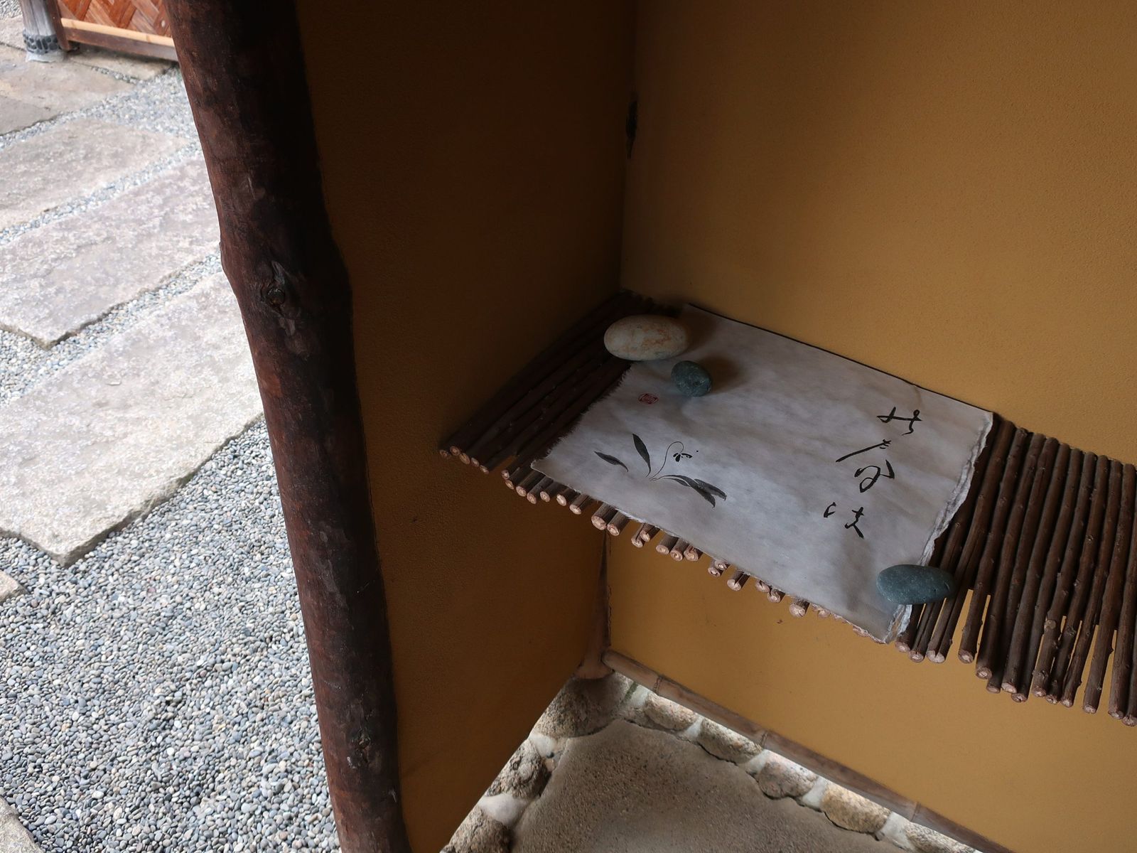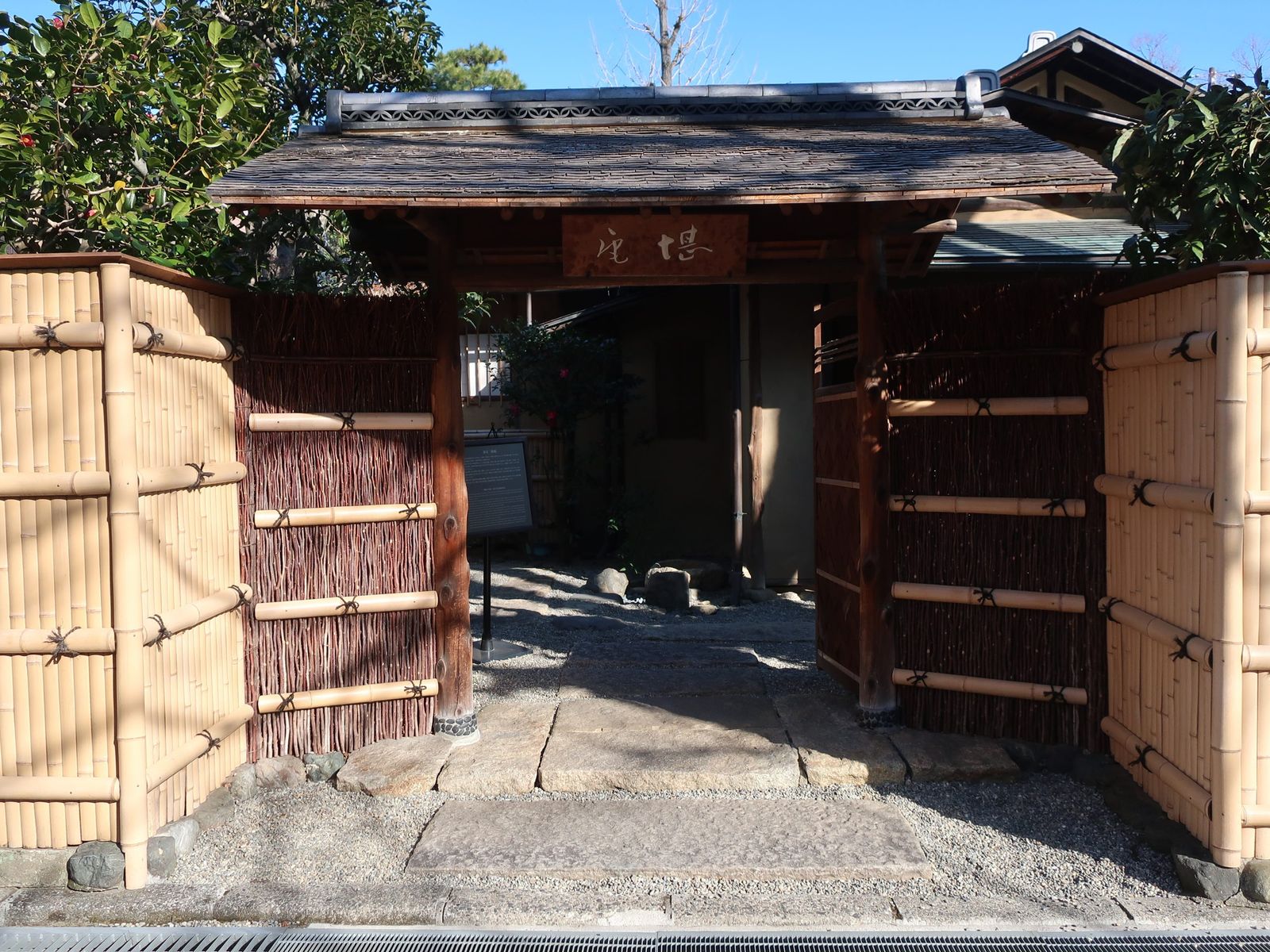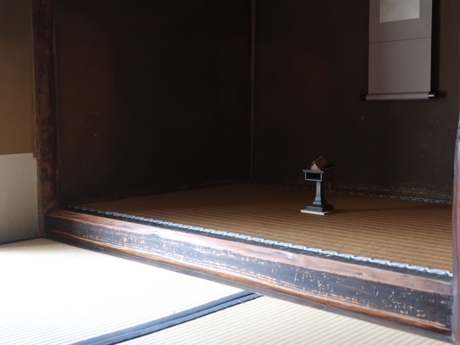 同展が行われた茶室「堪庵(たんあん)」は、江戸時代初期の京都における公家文化の伝統を受け継ぐ数寄屋造りの建物。八畳の書院座敷を中心に、正面に広縁(ひろえん・幅広の縁側)、左脇に玄関、裏に水屋があり、庭に面して自然と一体をなしている。