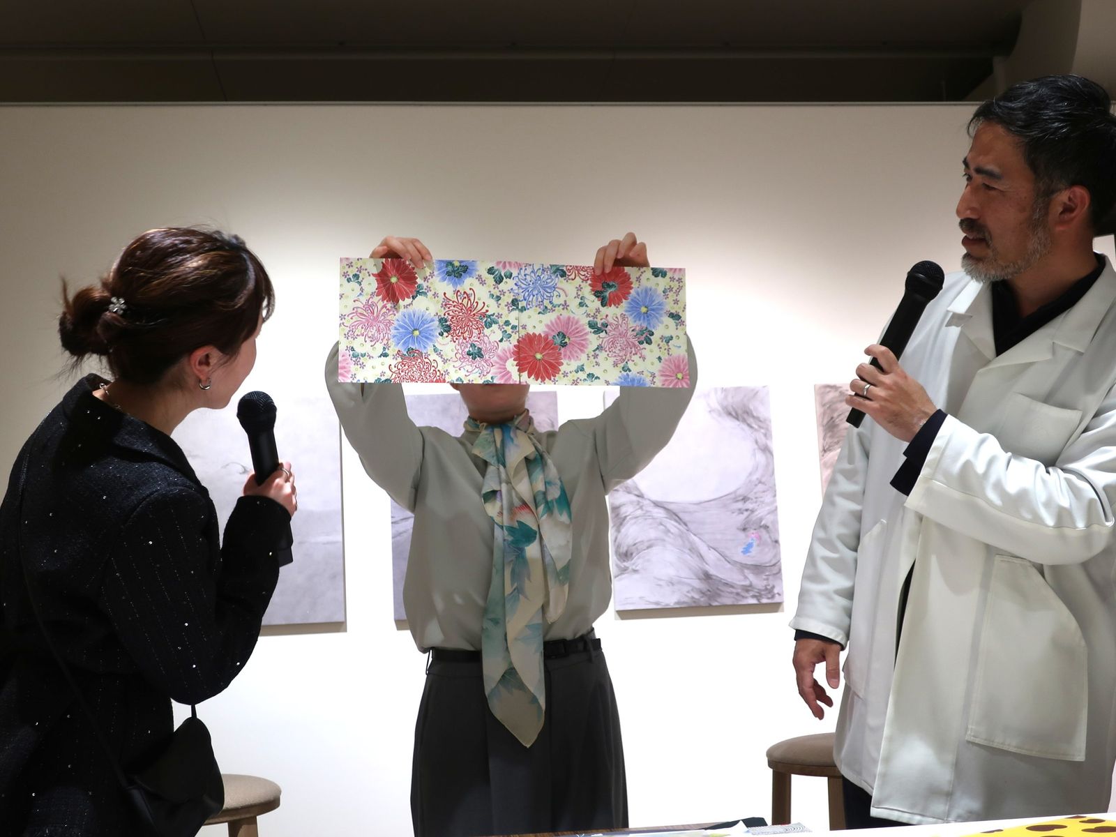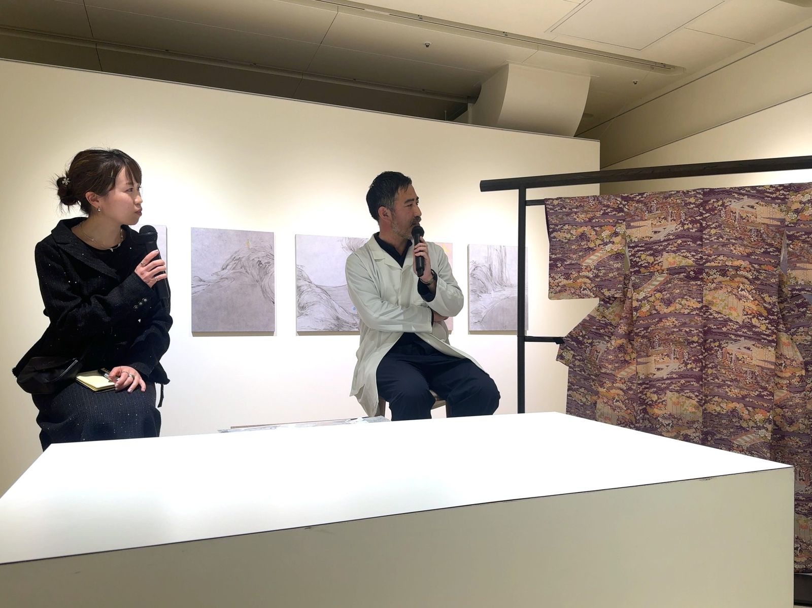 例えば、1555年創業の京友禅の老舗「千總(ちそう)」では、京都を拠点にする日本画家の松平莉奈の個展「無縫の天地」を4月14日まで開催している。AFK会期中の週末にはアーティスト・トークを実施し、松平と「千總」の今井淳裕製作プロデューサーが登壇した。2人は個展開催の経緯や展示作品、そして着物の模様構成に着想を得た、松平の新作のリピート模様について語ったほか、今井プロデューサーは図案デザインをデモンストレーション。立ち見がでるほど多く集まった観客からは拍手が起こった。
