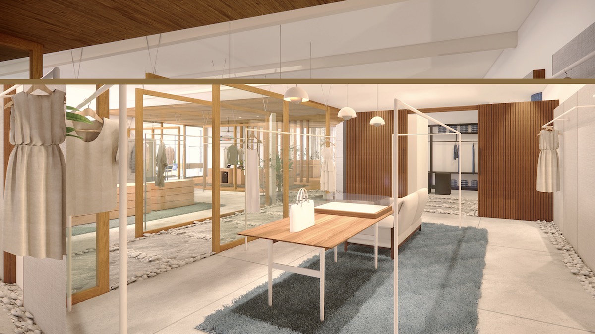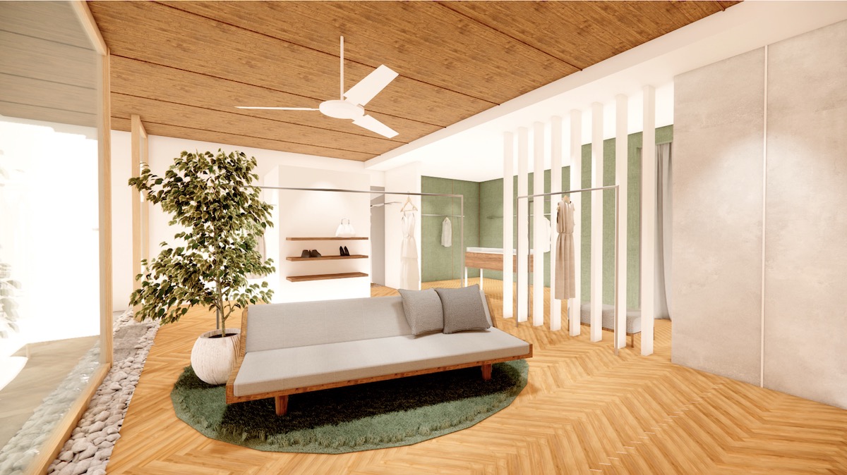 店内は、別荘をイメージし都市の喧騒から少しだけ距離を置いたようなゆったりとした時間が流れる空間に設計した。木の温もりや柔らかな照明、余白を活かしたレイアウトにより買い物という行為を“体験”へと昇華させる。