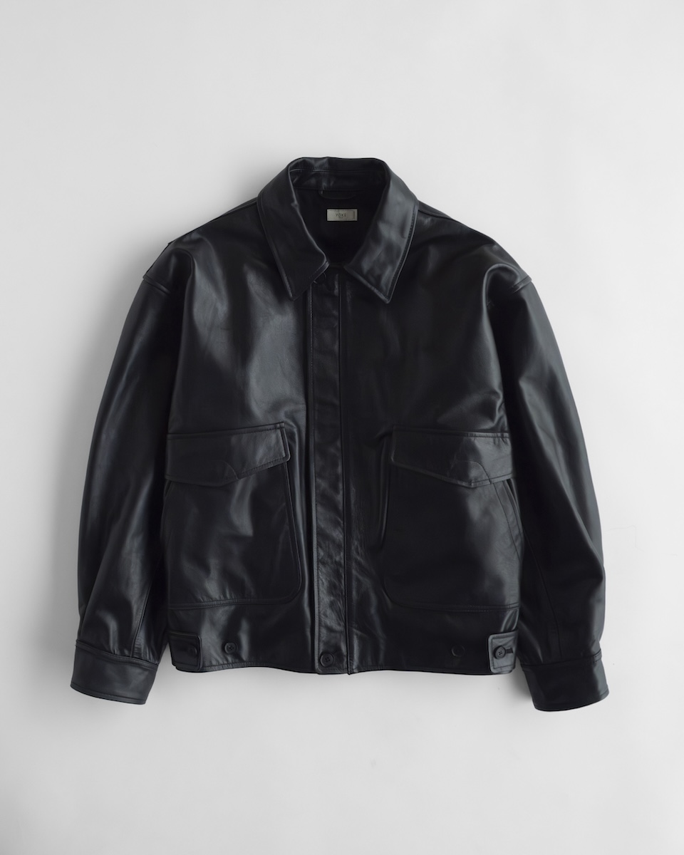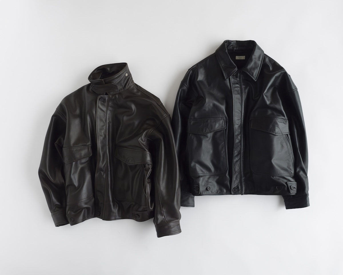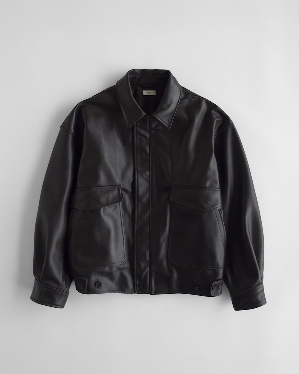 また「ヨーク」2025-26年秋冬で展開された“フライト ジャケット”をベースに「キータイムズ」のために制作した別注モデル(17万6000円)も取り扱う。素材は薄手のカウレザーから、柔らかさと耐久性を兼ね備えたベビーカー付レザーに変更し、デザインはA-2フライトジャケットをベースに、リブを排した共地仕様でミニマルに再構築した。