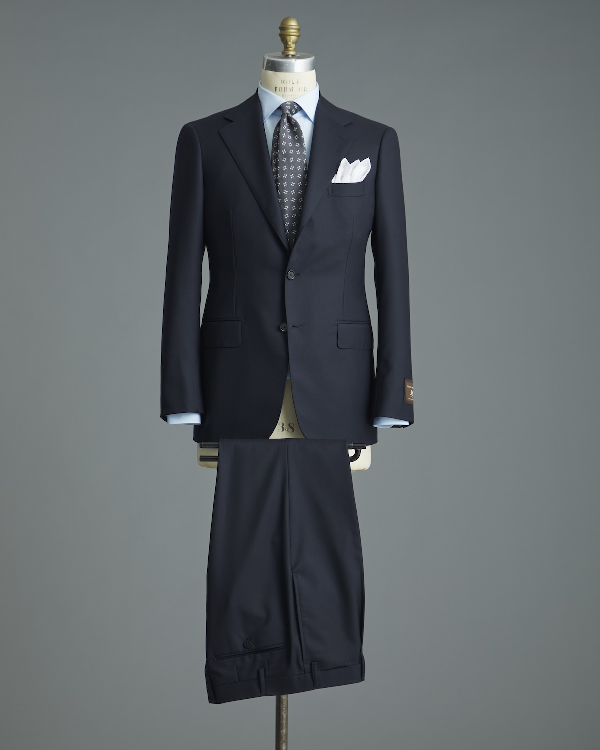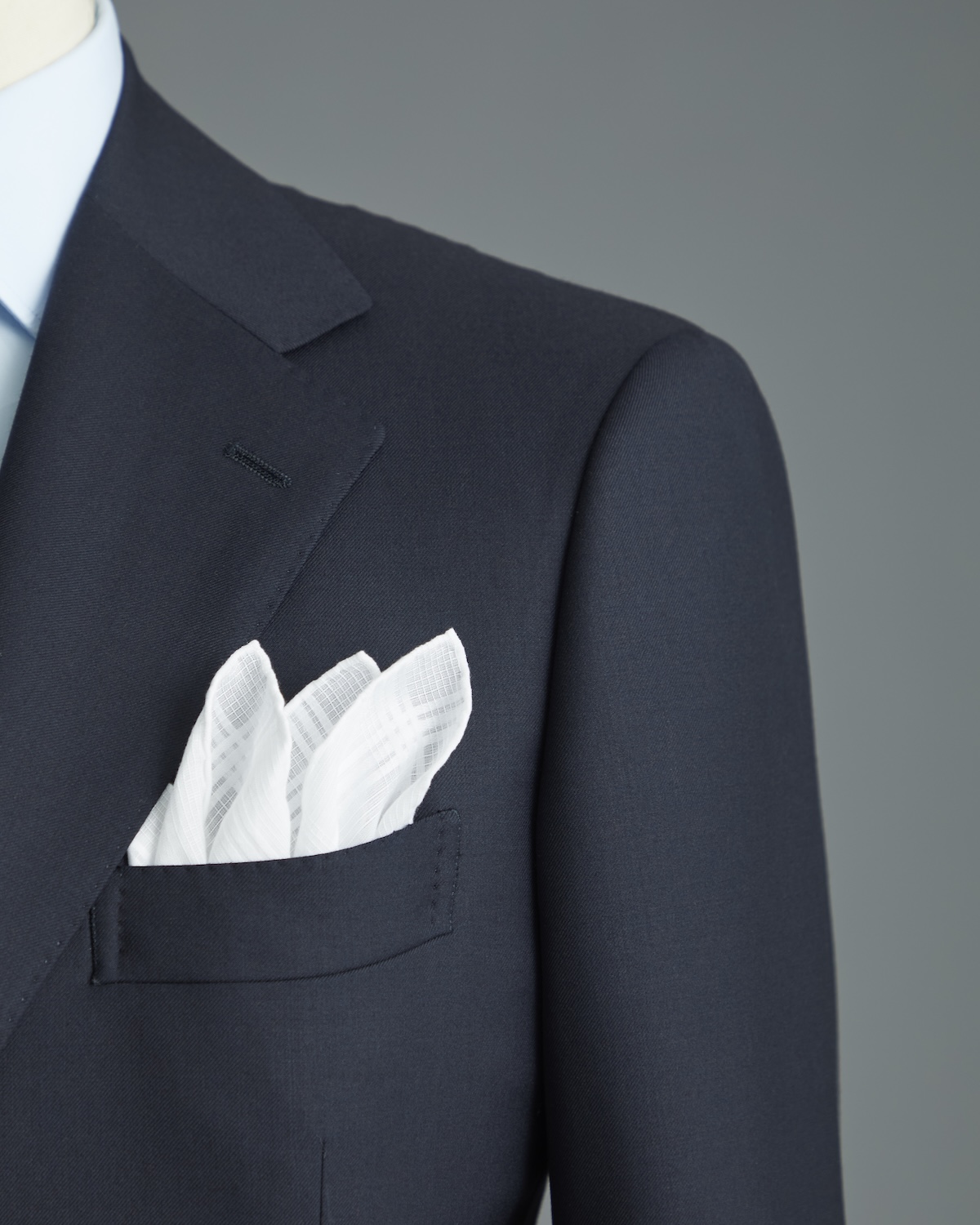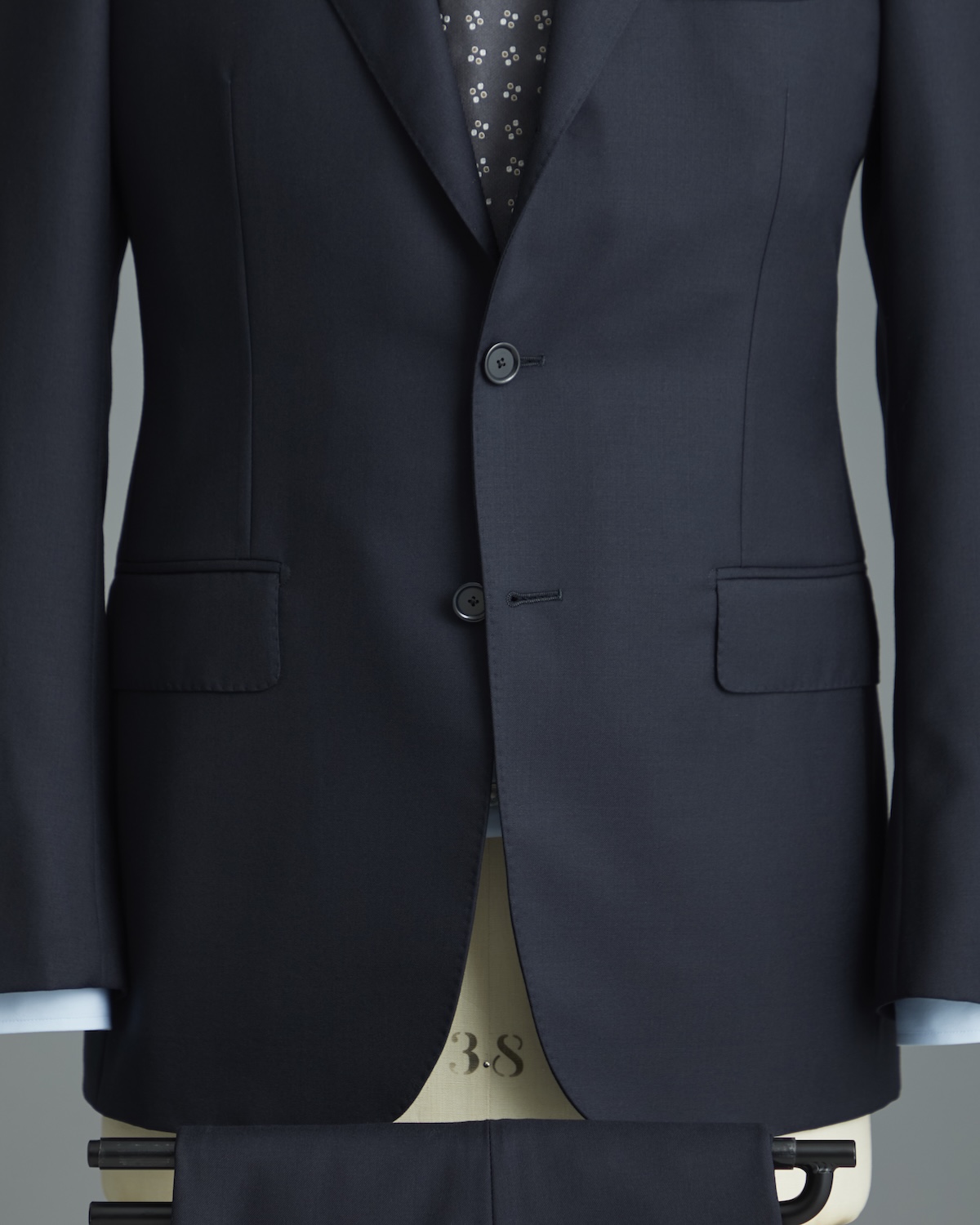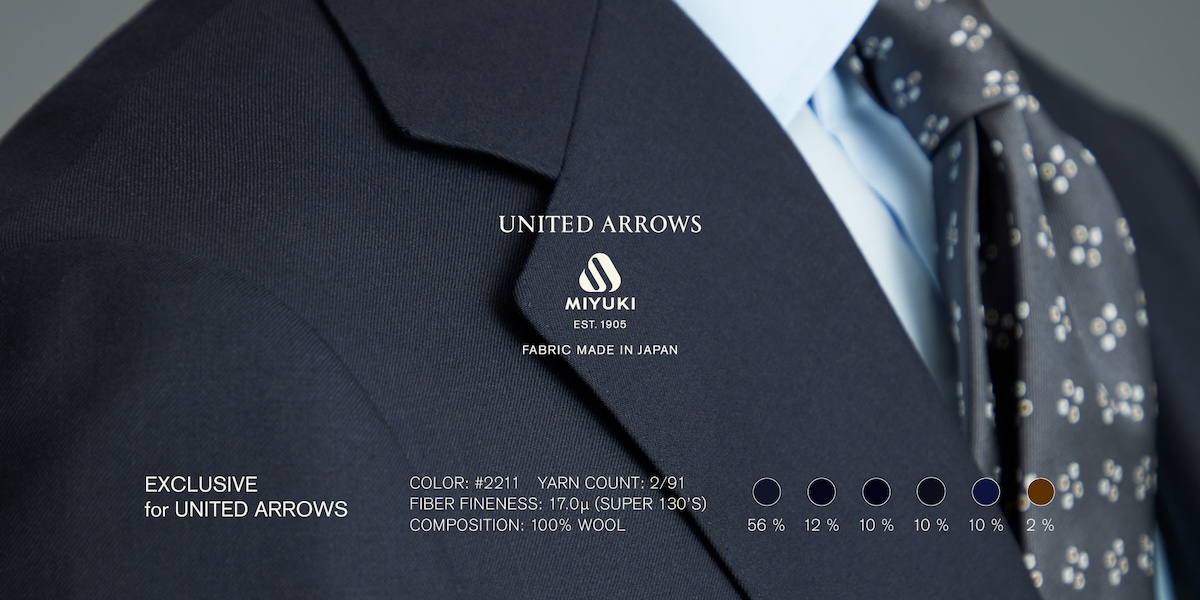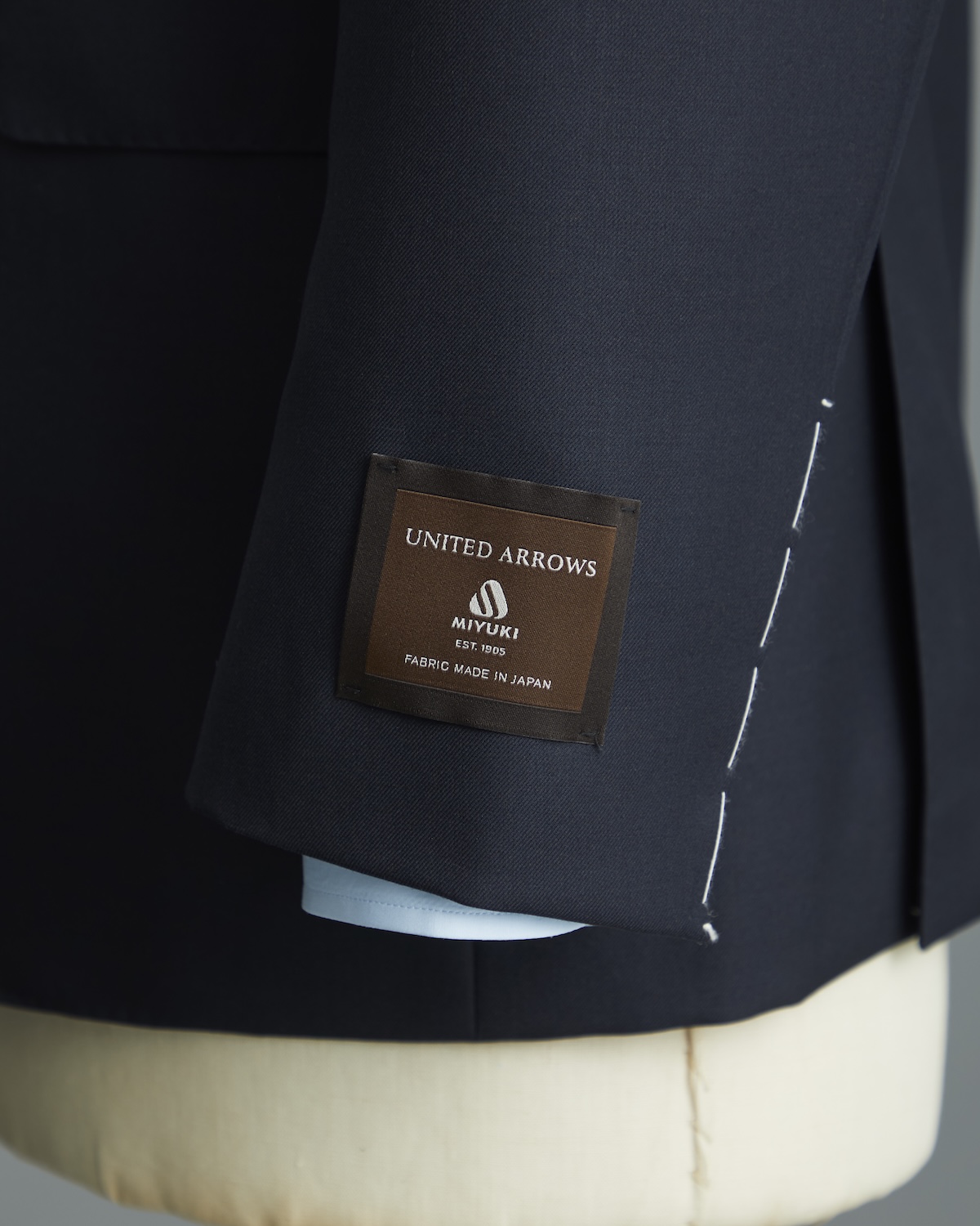 生地は、毛織メーカー“御幸毛織(MIYUKI)”と共同開発。黒味・青味・紫味にブラウンを2%だけ配合した6色の色綿をトップ染めし、全体が程よく和らいだ唯一無二のネイビーを表現した。また、上質なウール地を綾織りで織り上げた、柔らかな表情と上品な光沢感が特徴。日々のビジネスシーンに自然と馴染み、季節を問わず着用できる素材感に仕上げた。