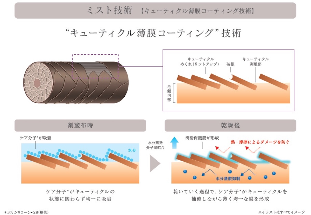“キューティクルリペアオイル”は、艶を与え、しっとりまとまりやすい髪に仕上げる。ドライヤーやアイロンの熱や摩擦などの外的刺激から髪を守るほか、夜使用すると就寝中の枕の摩擦から髪を守る。