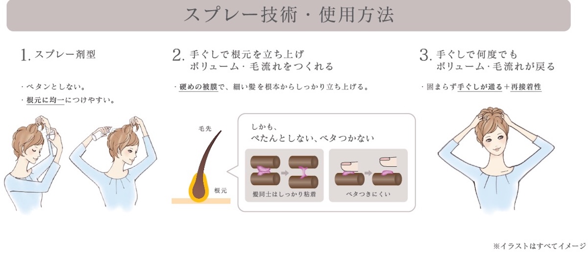 根元を立ち上げボリュームアップをかなえる“ナチュラルスタイルキーパー”は、トップのボリュームアップにも使えるほか、日中の広がりをいつもより出にくくする。スプレー剤型のため根元に均一につけやすくほか固まらず手ぐしが通り、日中スタイルが乱れた時は再度手ぐしを通すことで整え直すことができる。