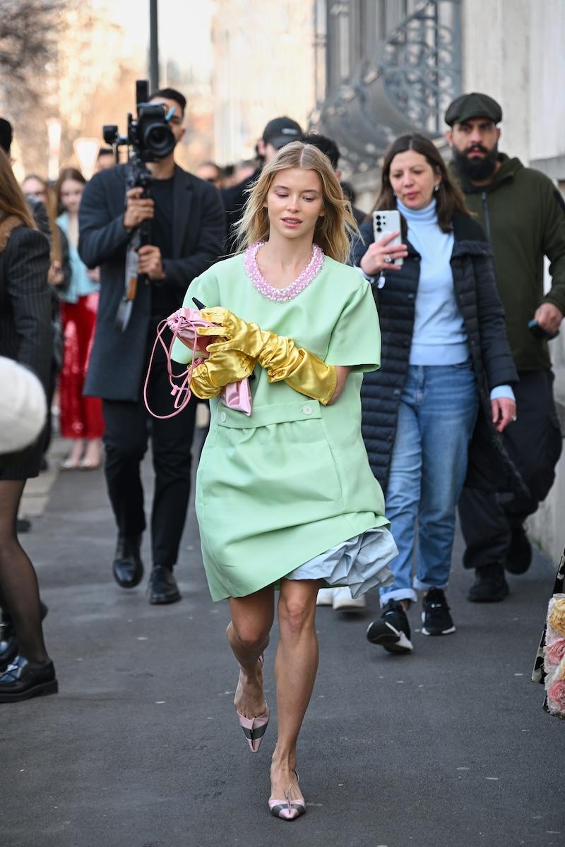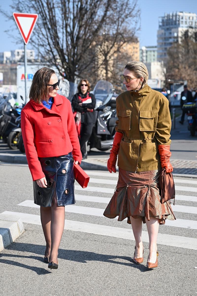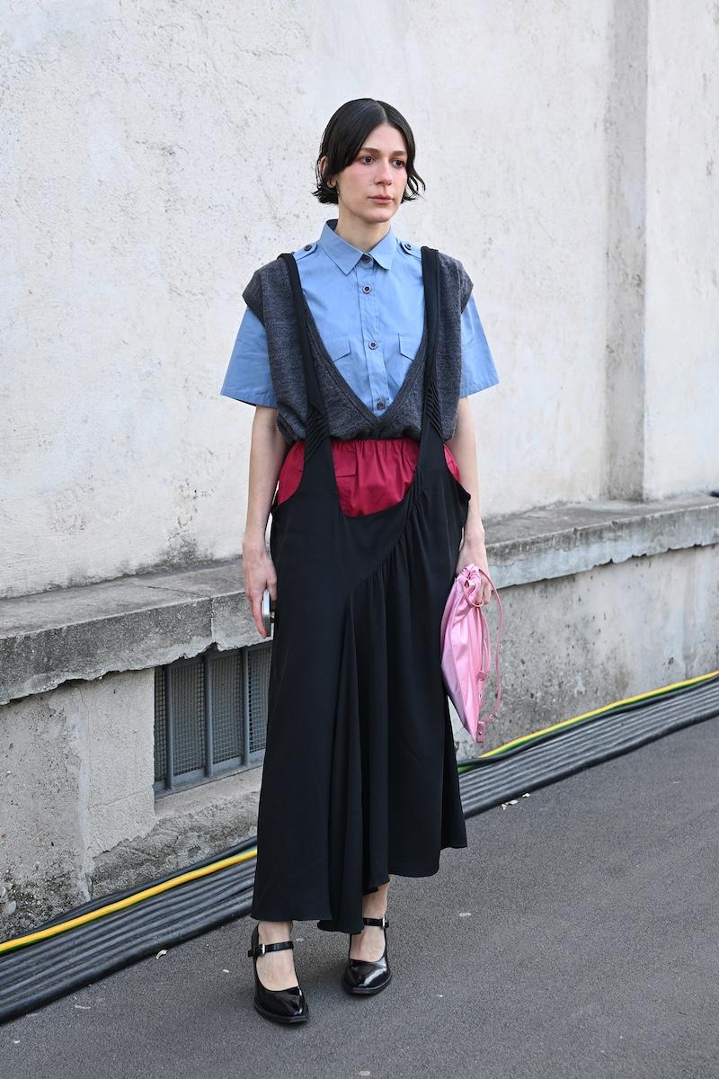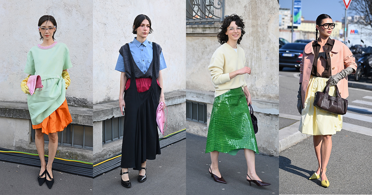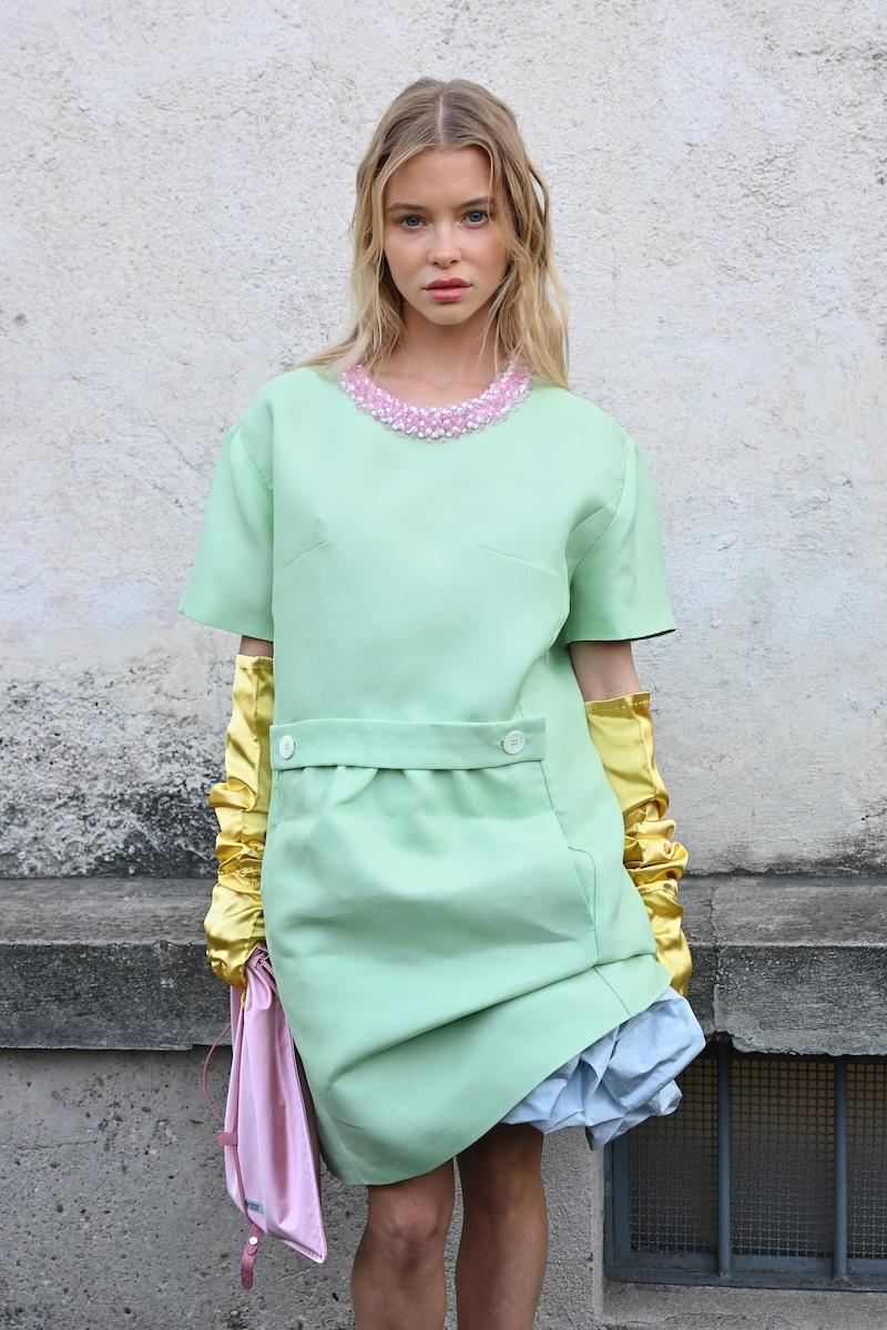 「プラダ(PRADA)」は、2026-27年秋冬コレクションをミラノで現地時間2月26日に発表した。会場周辺は、色とりどりの装いのゲストで溢れた。体を締め付けない1950年代風のドレス、タフタ素材のバブルスカート、アンダーゴムのないブラトップなど、“解放”をテーマにした26年春夏コレクションのアイテムをいち早く取り入れた装いが目立つ。パステルのカラーブロッキングが描くフェミニンなムードに対し、軍服を再解釈した無骨なスタイルがストリートで交差した。