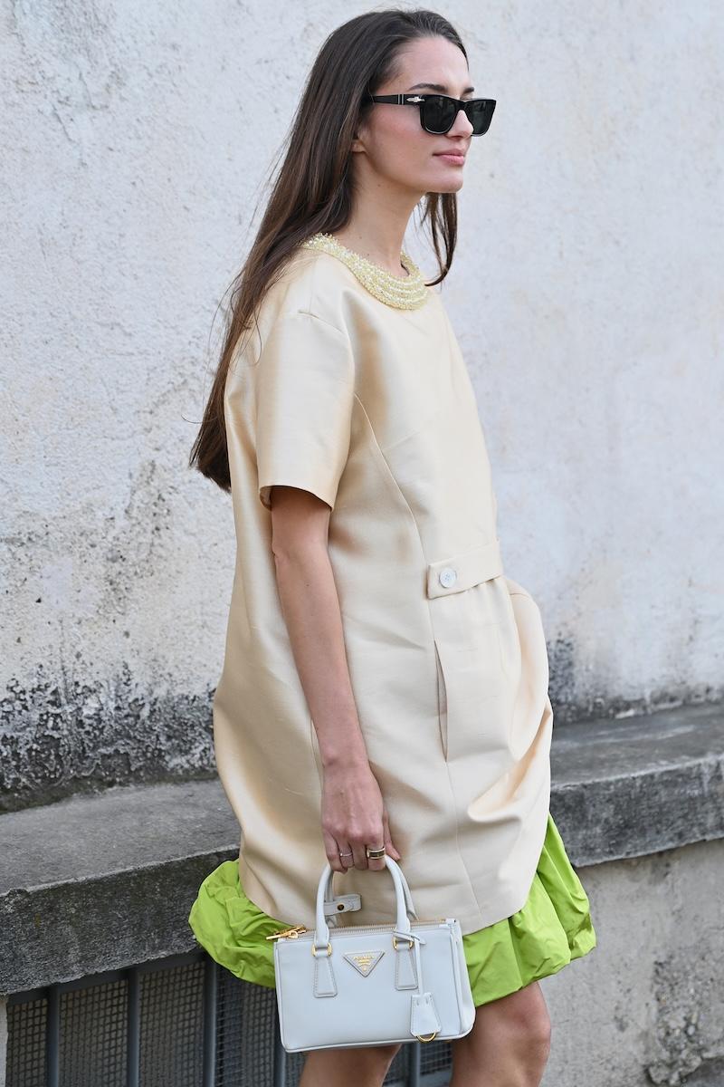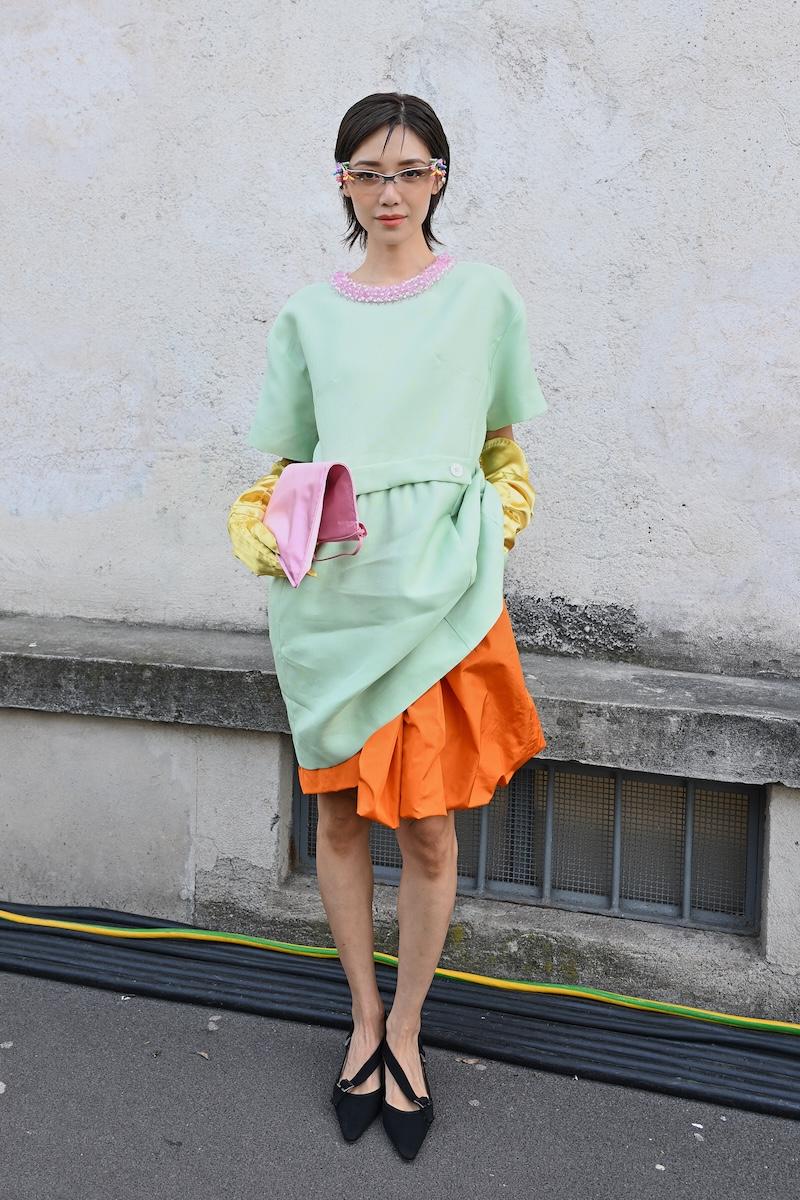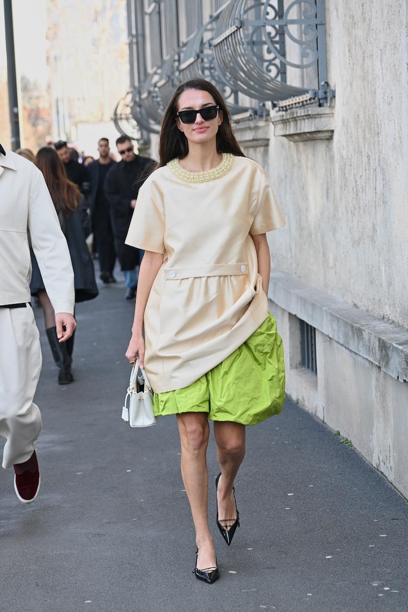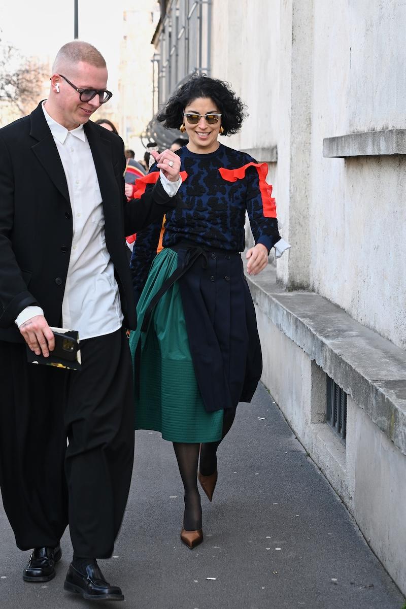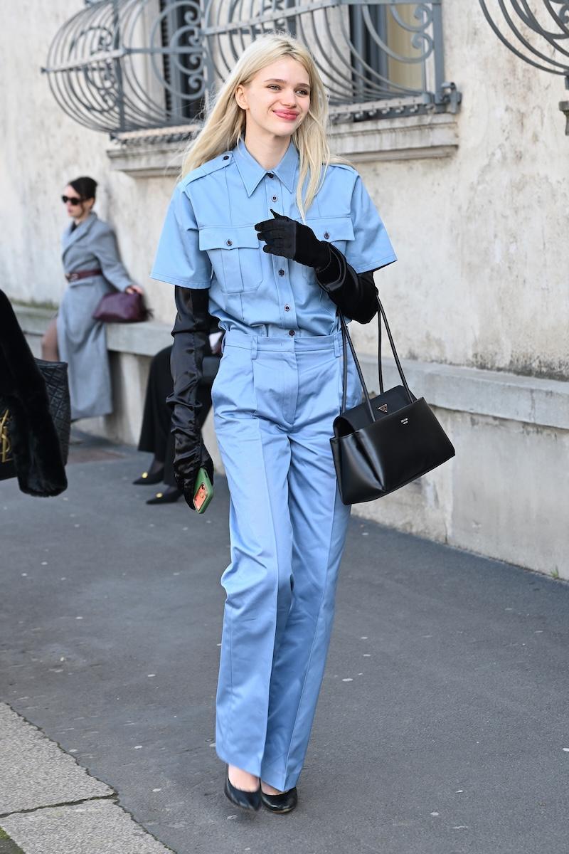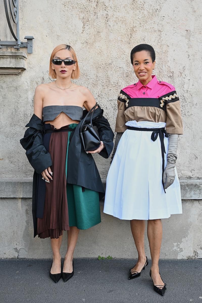 「プラダ(PRADA)」は、2026-27年秋冬コレクションをミラノで現地時間2月26日に発表した。会場周辺は、色とりどりの装いのゲストで溢れた。体を締め付けない1950年代風のドレス、タフタ素材のバブルスカート、アンダーゴムのないブラトップなど、“解放”をテーマにした26年春夏コレクションのアイテムをいち早く取り入れた装いが目立つ。パステルのカラーブロッキングが描くフェミニンなムードに対し、軍服を再解釈した無骨なスタイルがストリートで交差した。