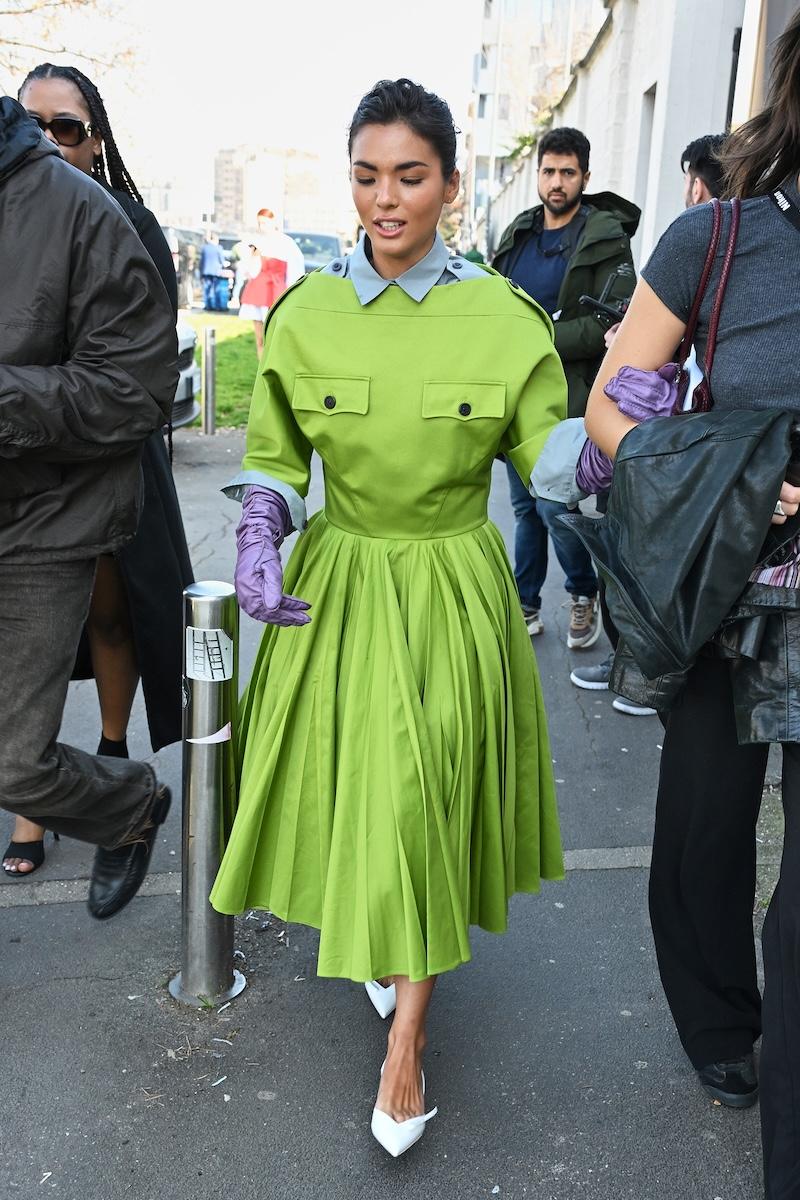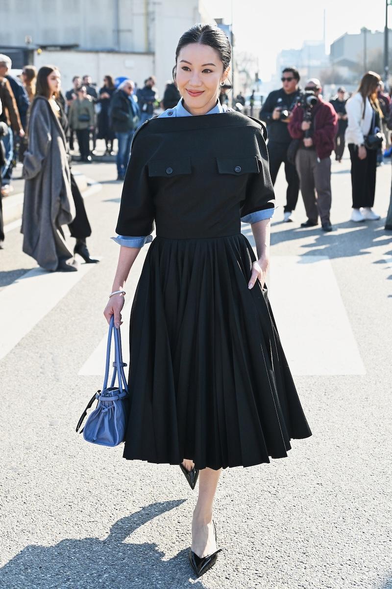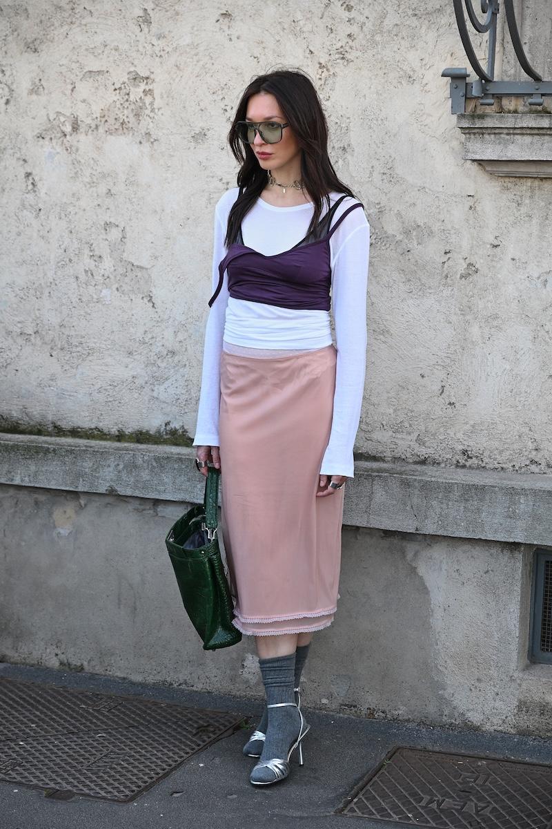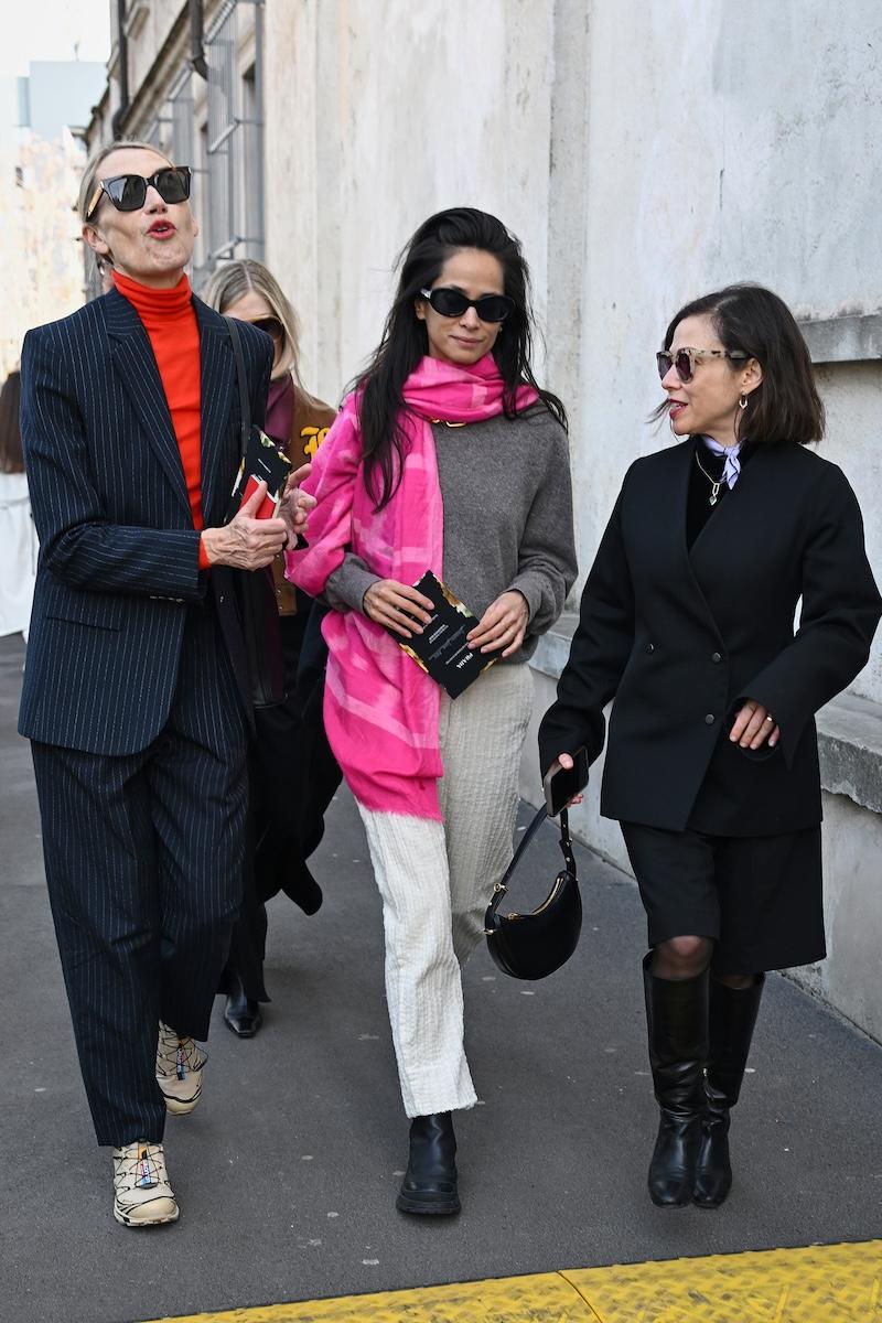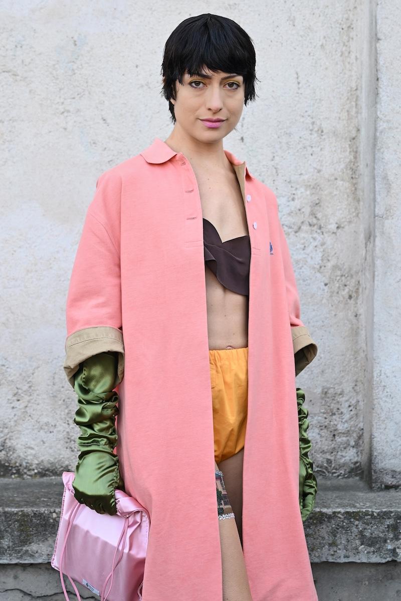 「プラダ(PRADA)」は、2026-27年秋冬コレクションをミラノで現地時間2月26日に発表した。会場周辺は、色とりどりの装いのゲストで溢れた。体を締め付けない1950年代風のドレス、タフタ素材のバブルスカート、アンダーゴムのないブラトップなど、“解放”をテーマにした26年春夏コレクションのアイテムをいち早く取り入れた装いが目立つ。パステルのカラーブロッキングが描くフェミニンなムードに対し、軍服を再解釈した無骨なスタイルがストリートで交差した。
