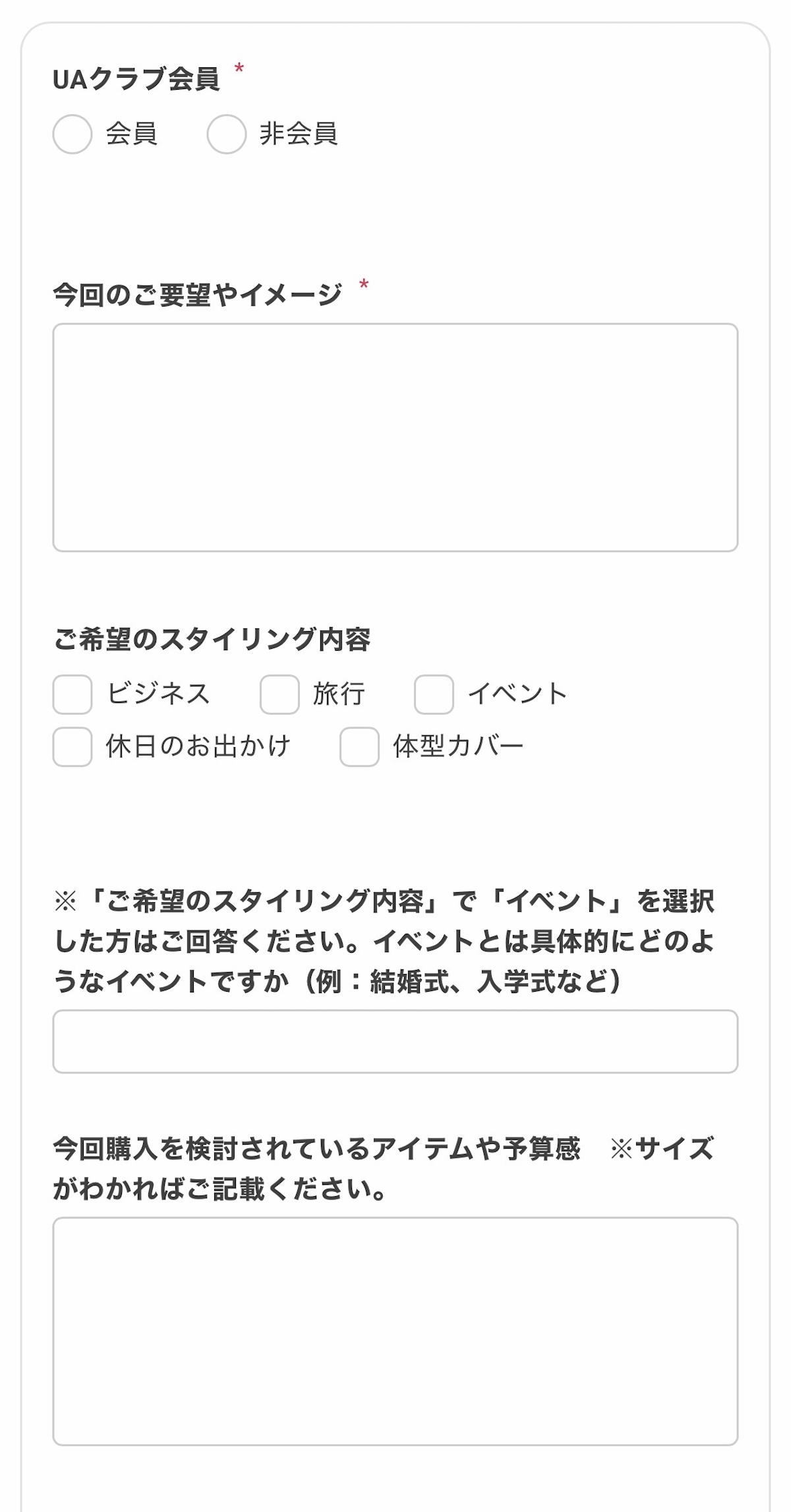 同サービスは、事前予約制で1日1枠のみ。利用料は無料。専用の予約フォームに、具体的な要望やイメージ、希望のスタイリング内容(ビジネス、旅行、イベント、休日のお出かけ、体型カバーから選択)を選択。さらに、購入を検討しているアイテムや予算感を記入すれば、予約は完了だ。