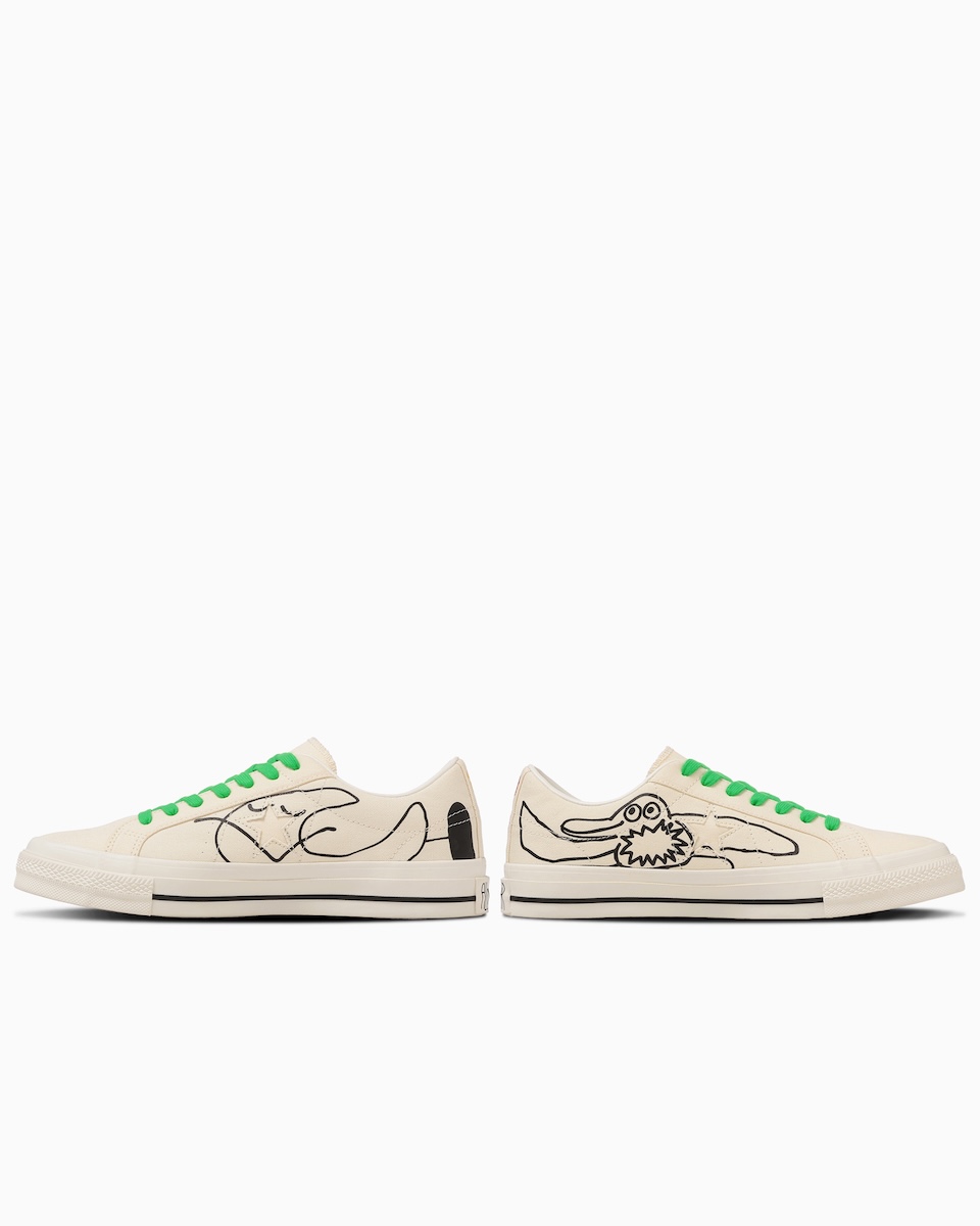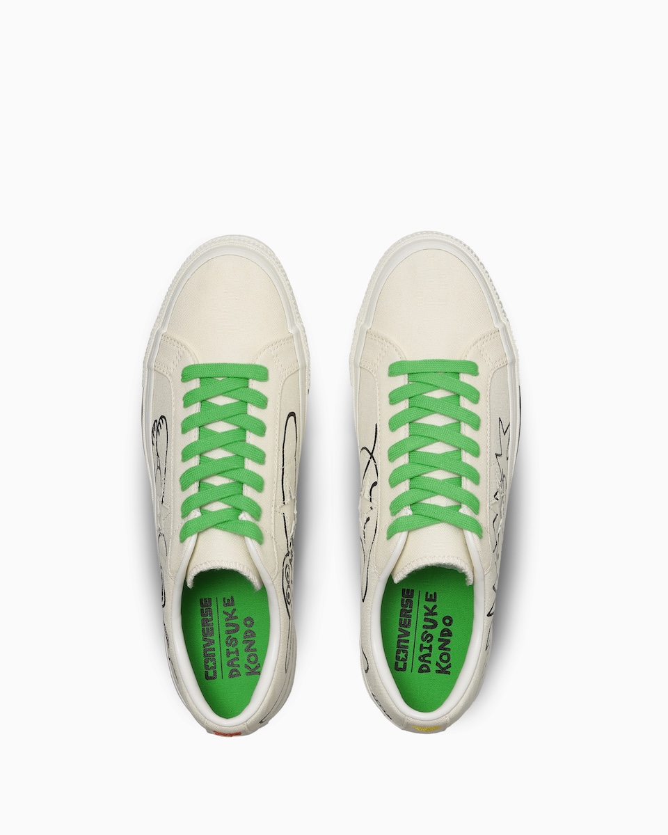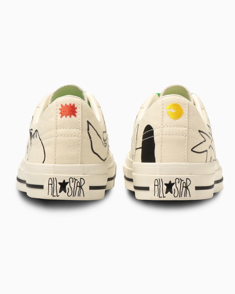 本モデルは、“ワンスターキャンバス(ONE STAR CANVAS)”をベースに、ダイスケ コンドウの世界観を落とし込んだ。キャンバスアッパーにはキャラクターをプリント。左足外腰にクマ、左足内腰にペンギン、右足外腰に月、右足内腰に太陽を配したアシンメトリーなデザインが特徴だ。踵には、左右それぞれ太陽と月のモチーフを刺しゅうで施した。ビビッドなグリーンのインソールには同氏のサインをプリントし、ヒールラベルには書き下ろしの“オールスター(ALL STAR)”のロゴを採用。また、ホワイトのスペアシューレースが付属し、オリジナルカートン入りだ。インソールには高密度ウレタンフォームと“E.V.A.”による2層構造を採用し、クッション性を向上させた。サイズ展開は23.0〜28.0、29.0cm。