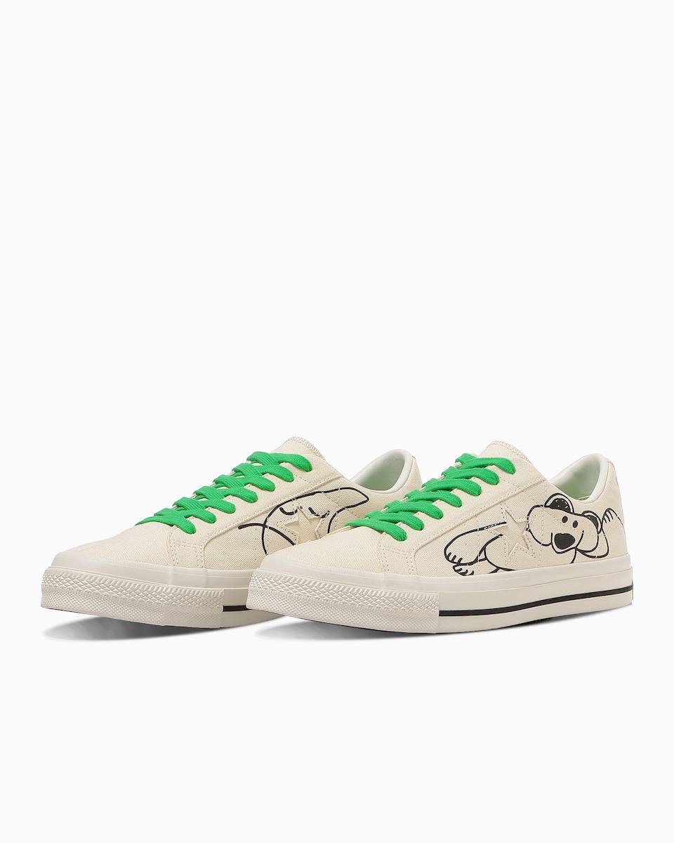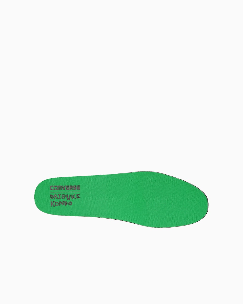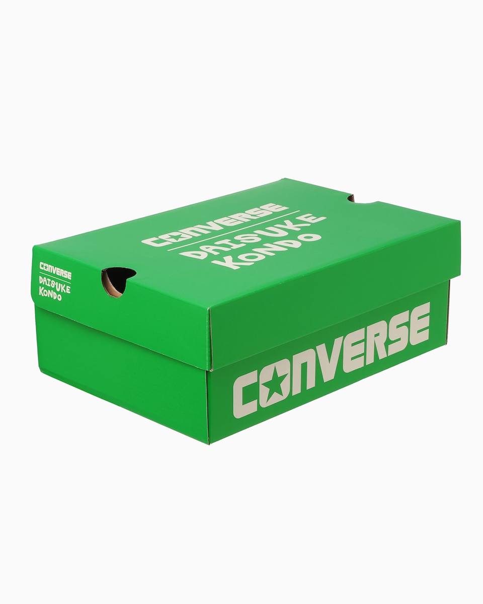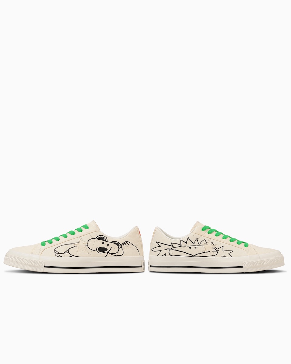 本モデルは、“ワンスターキャンバス(ONE STAR CANVAS)”をベースに、ダイスケ コンドウの世界観を落とし込んだ。キャンバスアッパーにはキャラクターをプリント。左足外腰にクマ、左足内腰にペンギン、右足外腰に月、右足内腰に太陽を配したアシンメトリーなデザインが特徴だ。踵には、左右それぞれ太陽と月のモチーフを刺しゅうで施した。ビビッドなグリーンのインソールには同氏のサインをプリントし、ヒールラベルには書き下ろしの“オールスター(ALL STAR)”のロゴを採用。また、ホワイトのスペアシューレースが付属し、オリジナルカートン入りだ。インソールには高密度ウレタンフォームと“E.V.A.”による2層構造を採用し、クッション性を向上させた。サイズ展開は23.0〜28.0、29.0cm。