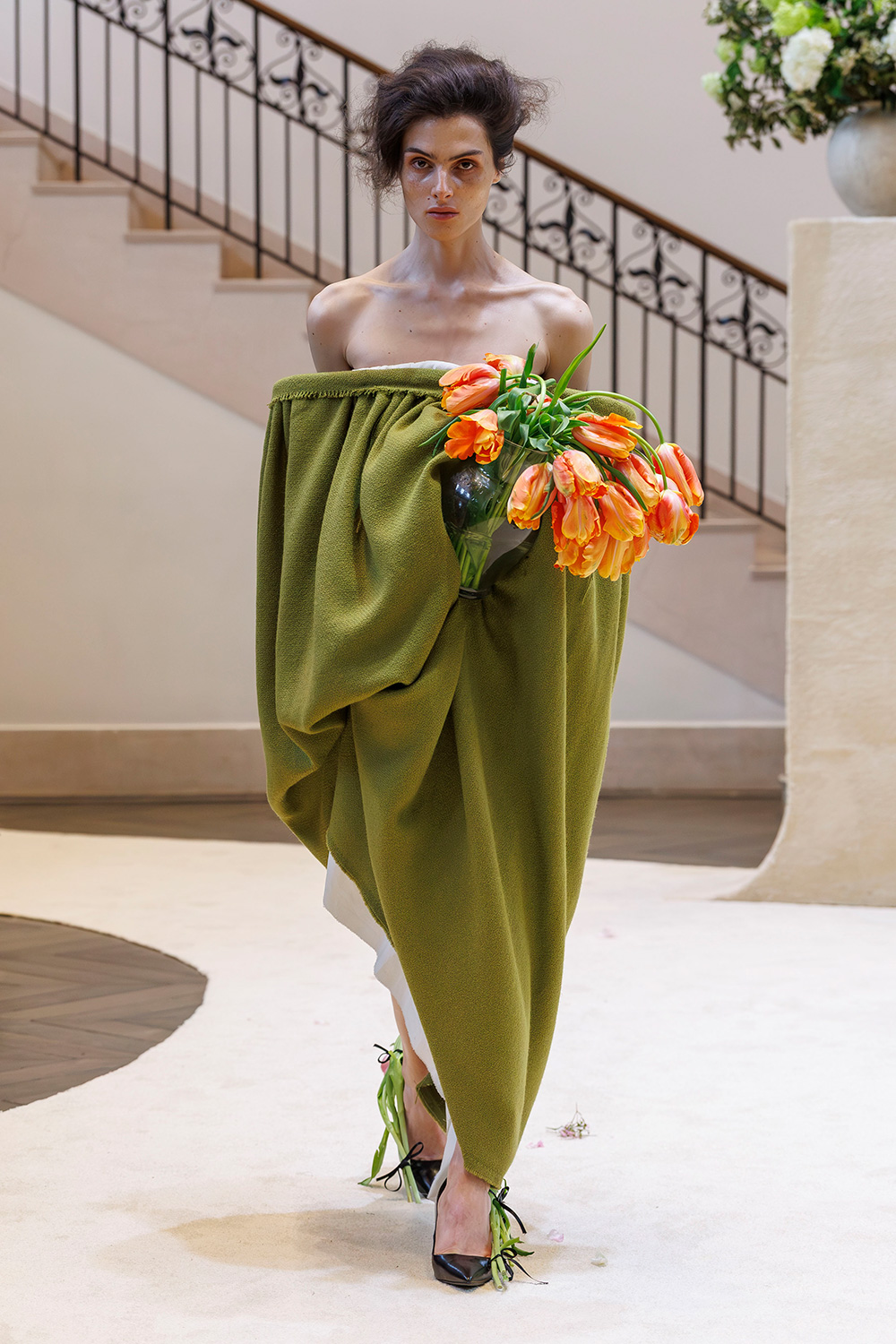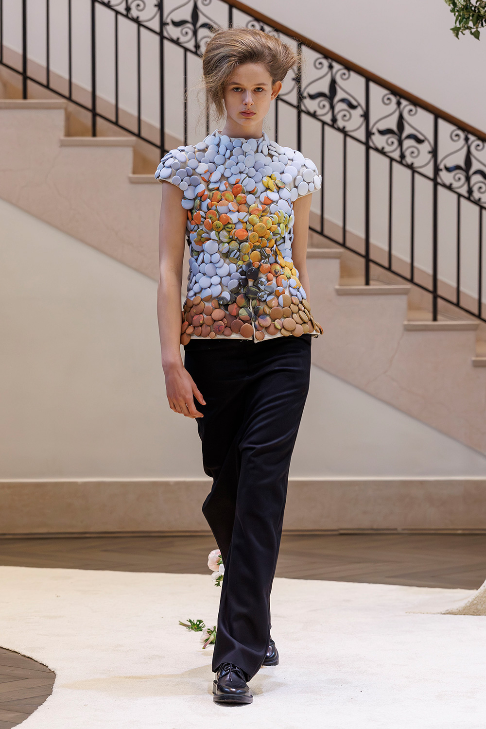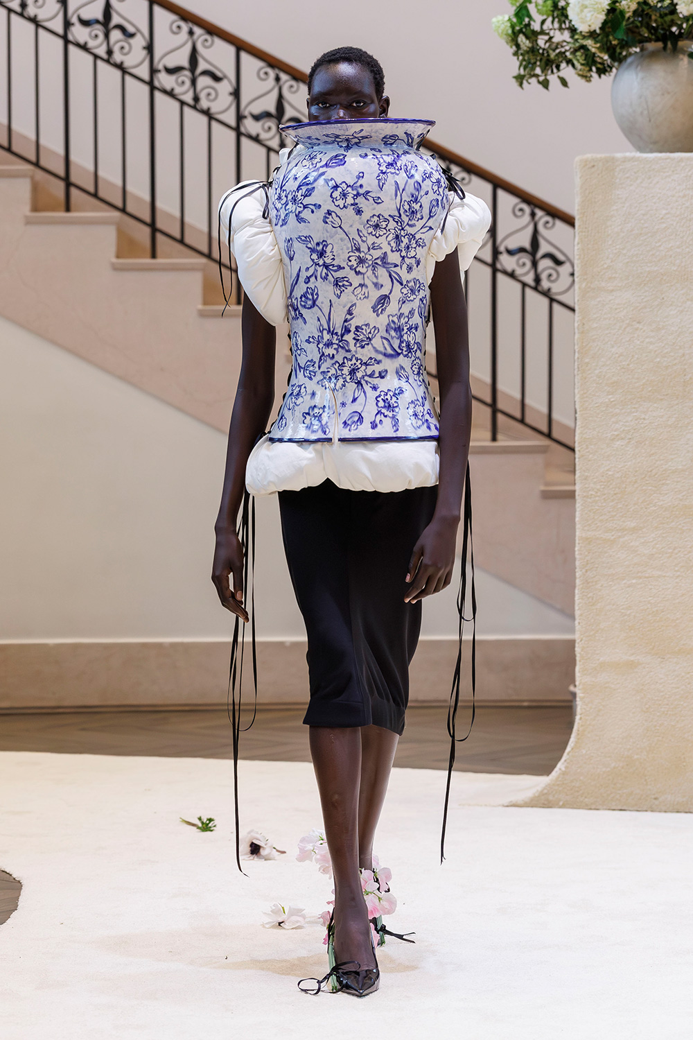 3年の歳月を費やし制作したコレクションのタイトルは、「ザ・ナルシシスト」。自己と向き合い、花、陶磁器、ガラスといった彼の半生を象徴するモチーフを服に埋め込んだ。厚手のウールやフェルトの生地にセラミックパーツを直接縫い付けたり、体の曲線に沿わせて作った木材のフレームに小さな模型を装飾したりしながら、美しい一着に濃厚なドラマを凝縮させた。それらを静止したオブジェではなく、あえてモデルにまとわせたのは、そこに「動き」という命を宿したかったからだという。