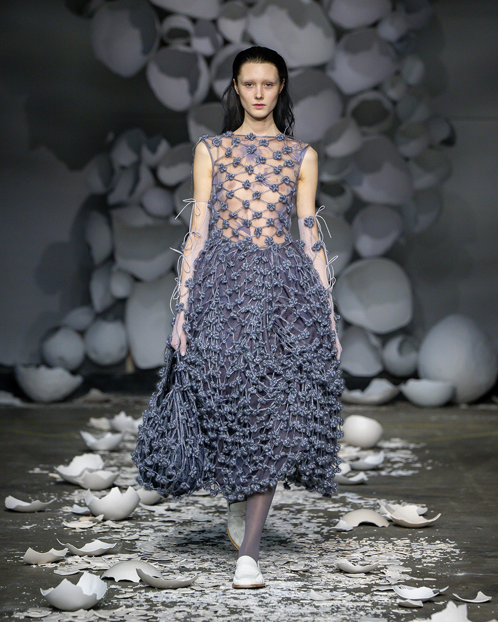 若手支援プログラム「ニュージェン(NEW GEN)」枠で発表した。魔女狩りという歴史の闇に光を当て、消し去られた女性たちの物語を、得意のニットで繊細かつポエティックな世界観で表現した。80本以上のチュールの帯を巻きつけたマクラメや小さなクロシェの花々を全身にちりばめたドレスなど、ニットの表現をクチュールに昇華した。