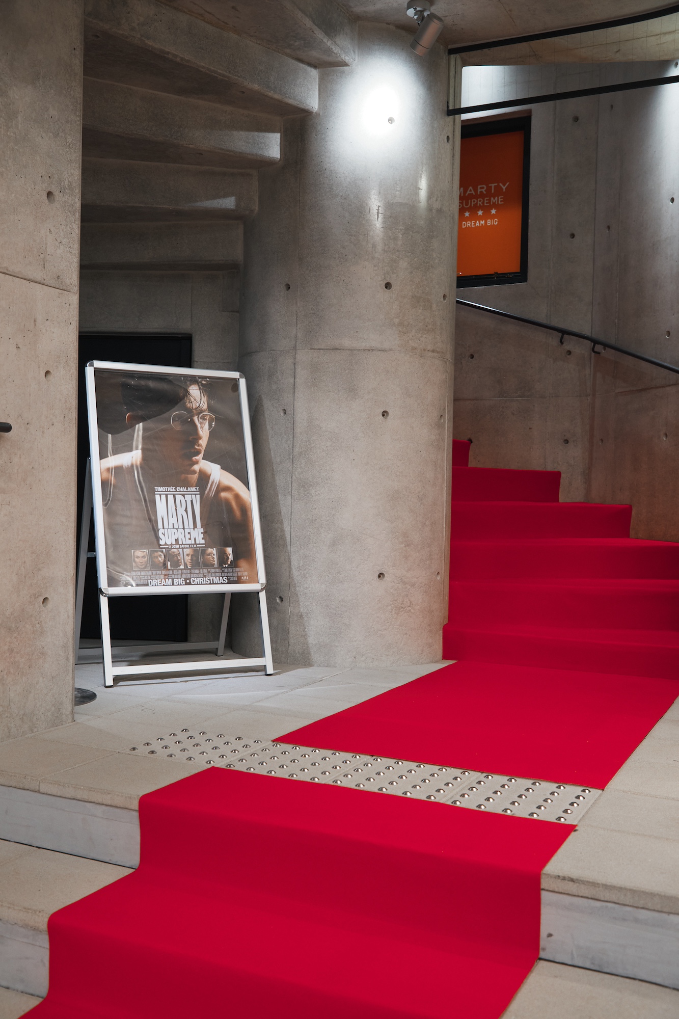 店内の1階から2階のポップアップまでレッドカーペットが敷かれているのに加えて、随所に作品の場面ビジュアルが配置されており、特別な雰囲気が感じられる空間となっている。
