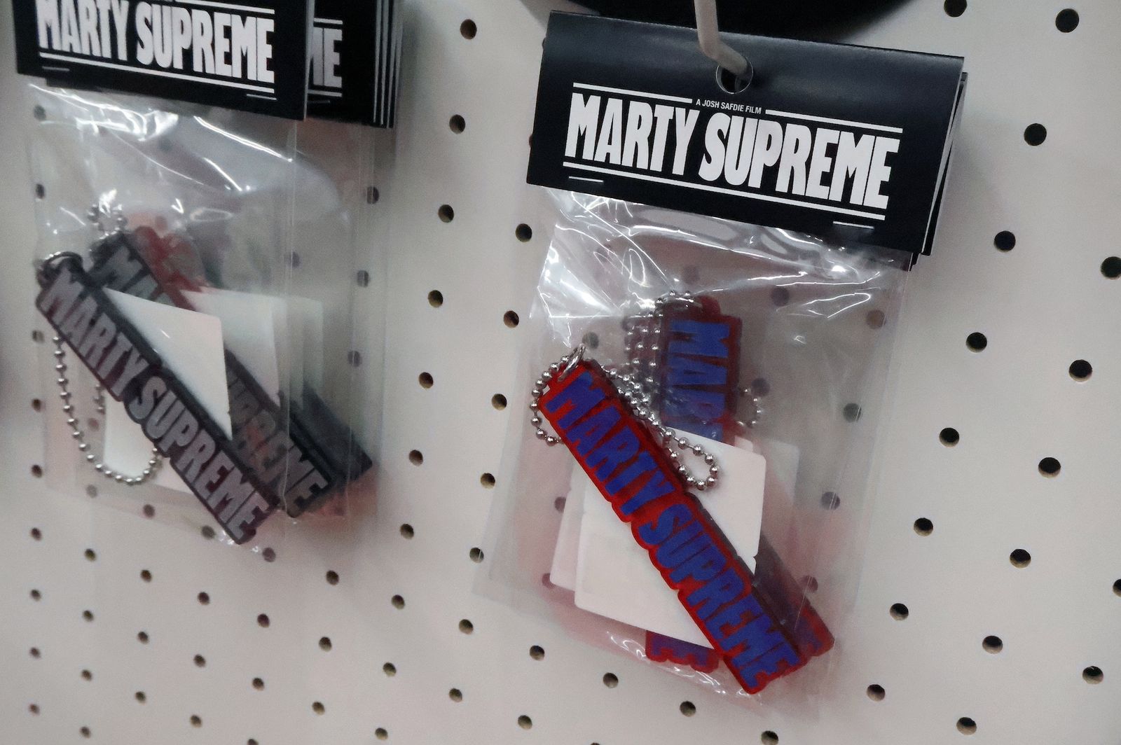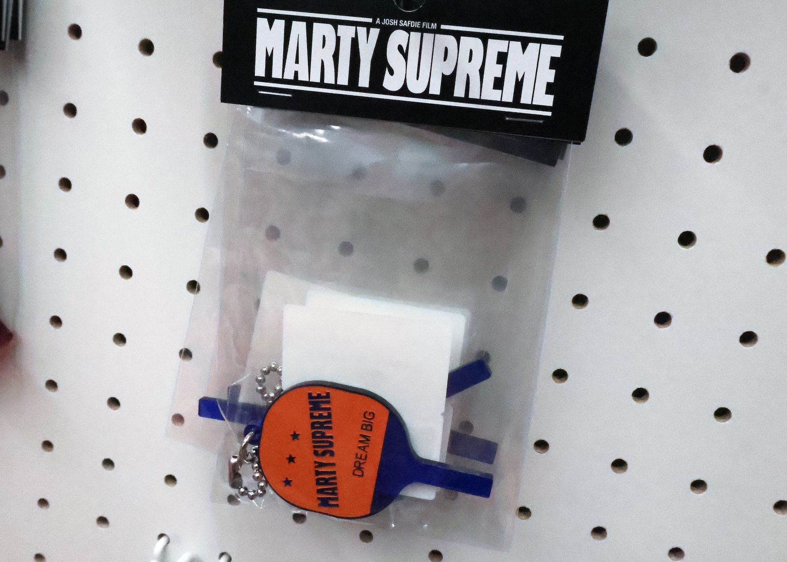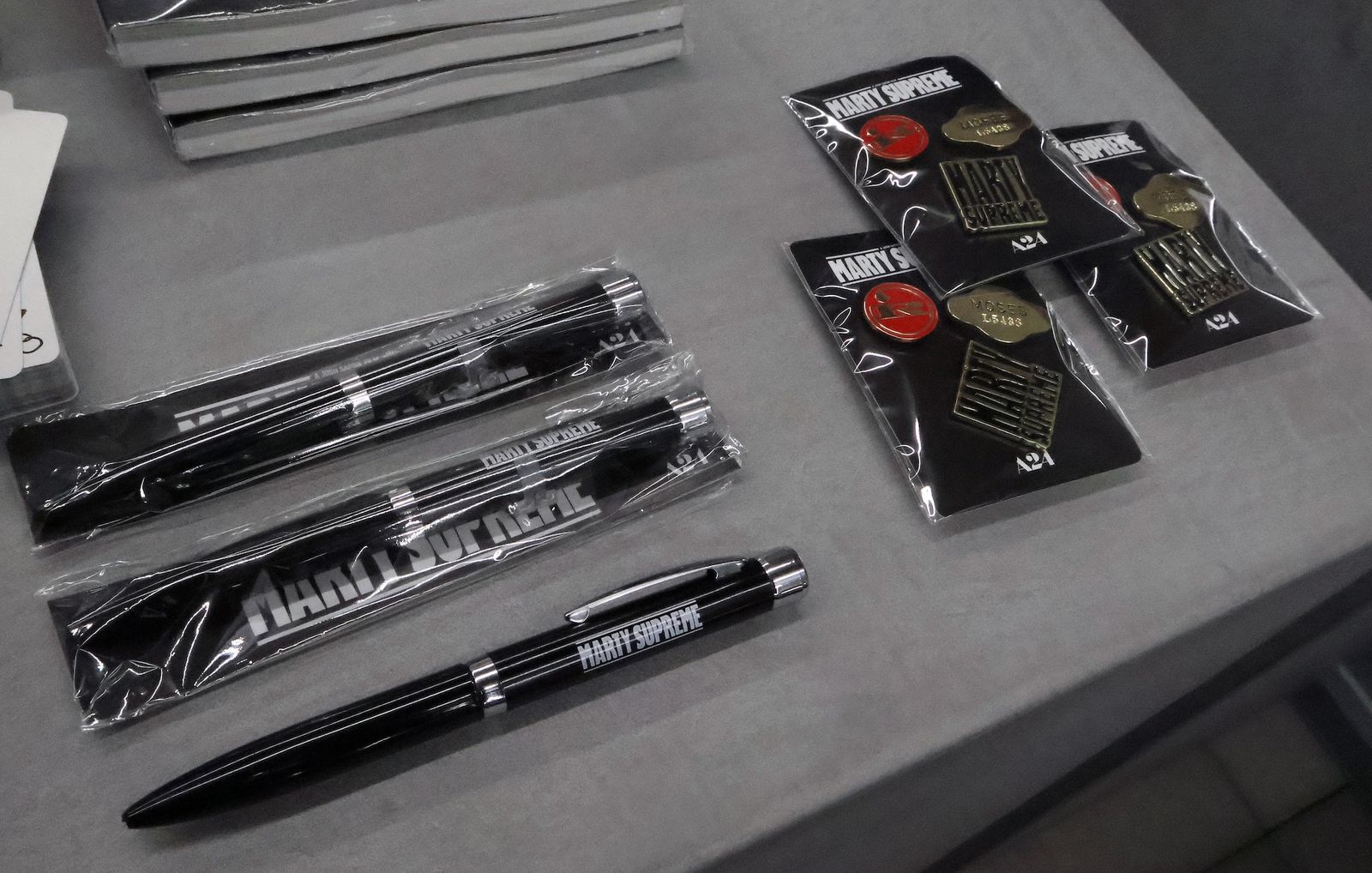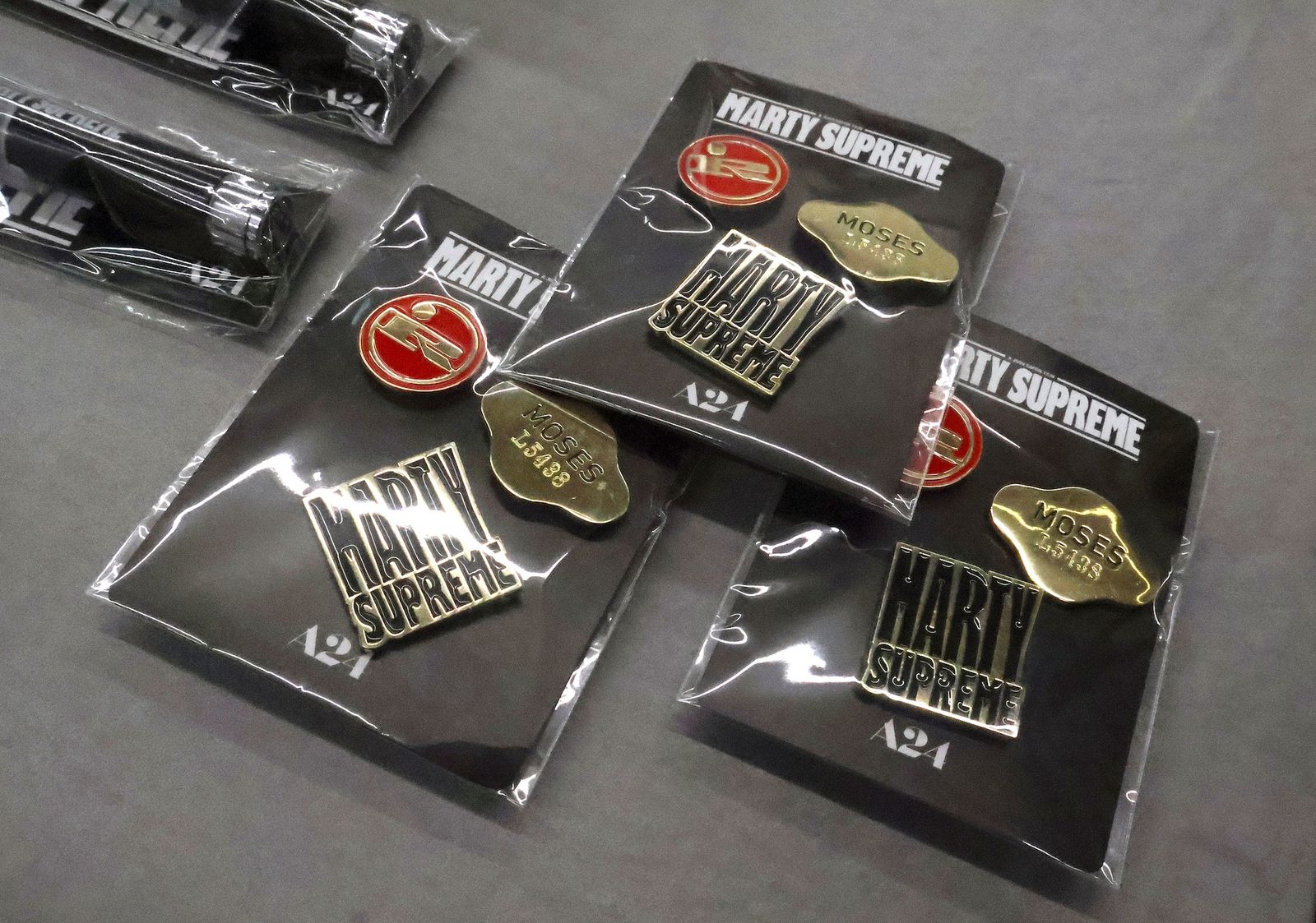 他にもキーホルダー、ライト付きボールペン、ピンバッチといった小物もラインアップ。キーホルダーは卓球のラケット型や英字の「MARTY SUPREME」など。ライト付きボールペンでは、ピンポン玉が投影される遊び心溢れる仕様に。ピンバッジはロゴのほか、劇中のモチーフを採用したデザイン。