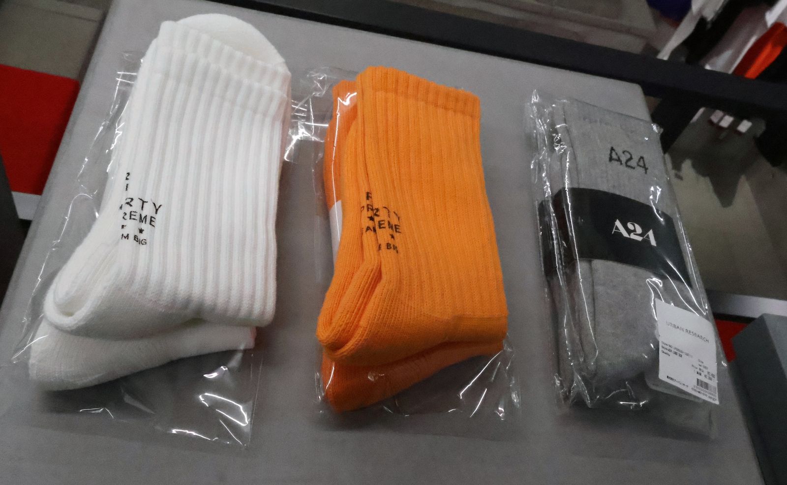 ロゴをプリントしたソックス。白とオレンジの2色展開で、初日はオレンジのソックスが特に人気だった。